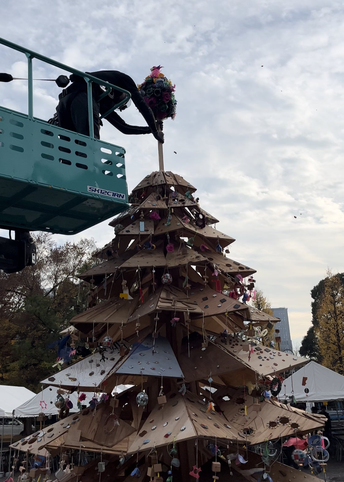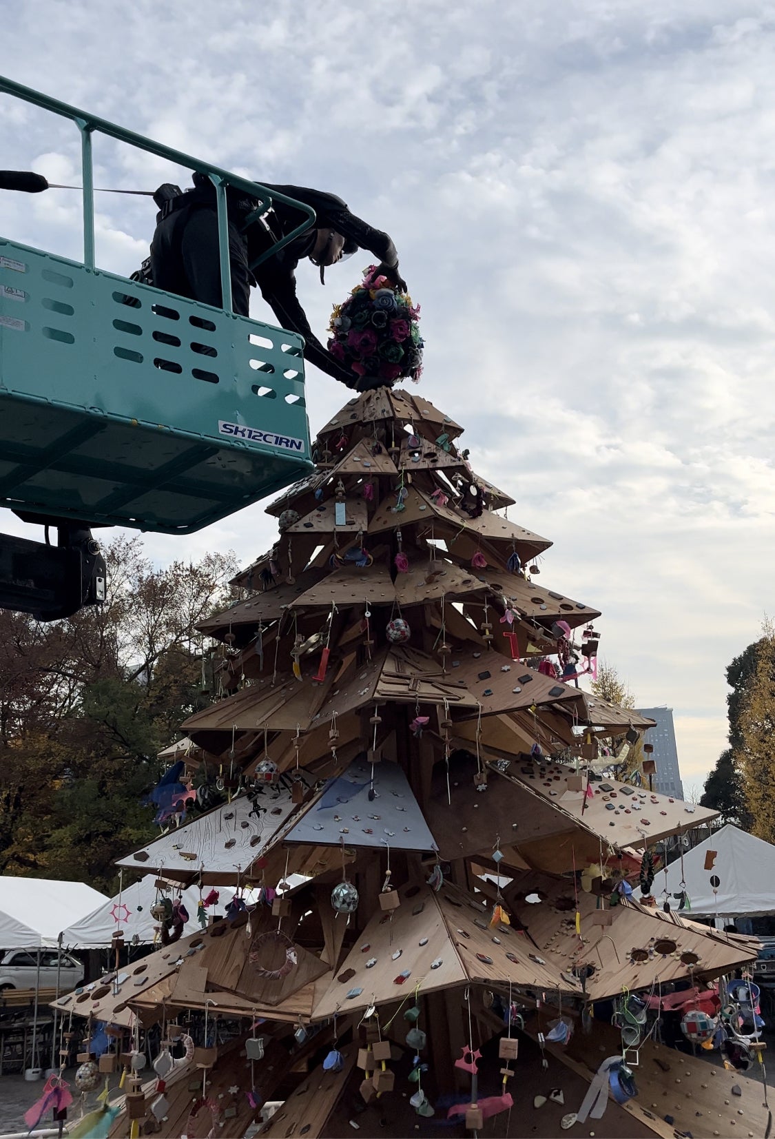 下の方の大きな葉っぱがあるので、高所作業車でオーナメントを設置!