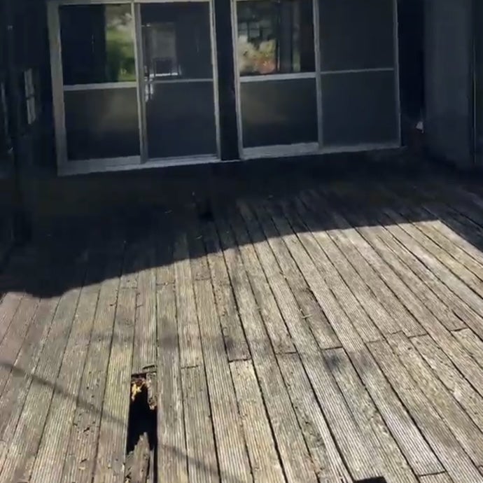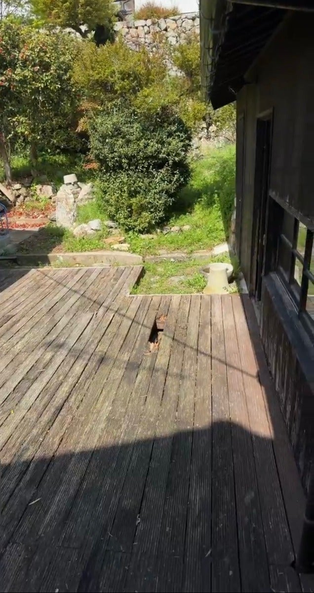 ▼老朽化したウッドデッキ、庭