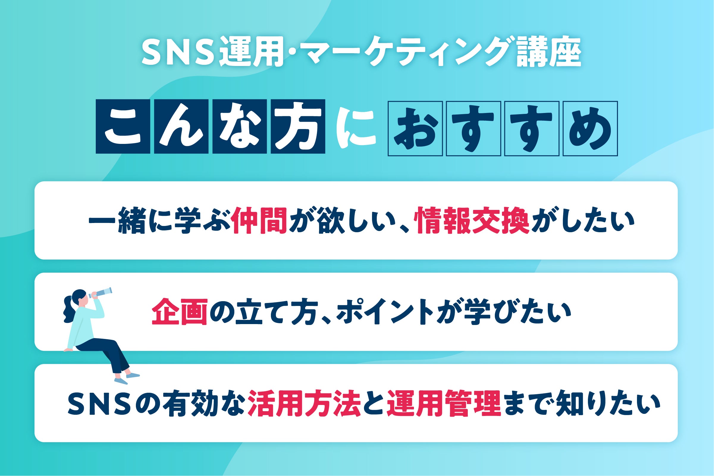 あらゆる業種や事業規模に関わらず、SNSマーケティングの知識を持つ人材を育てることで、個人のキャリアをもっと輝かせたいと考えています。