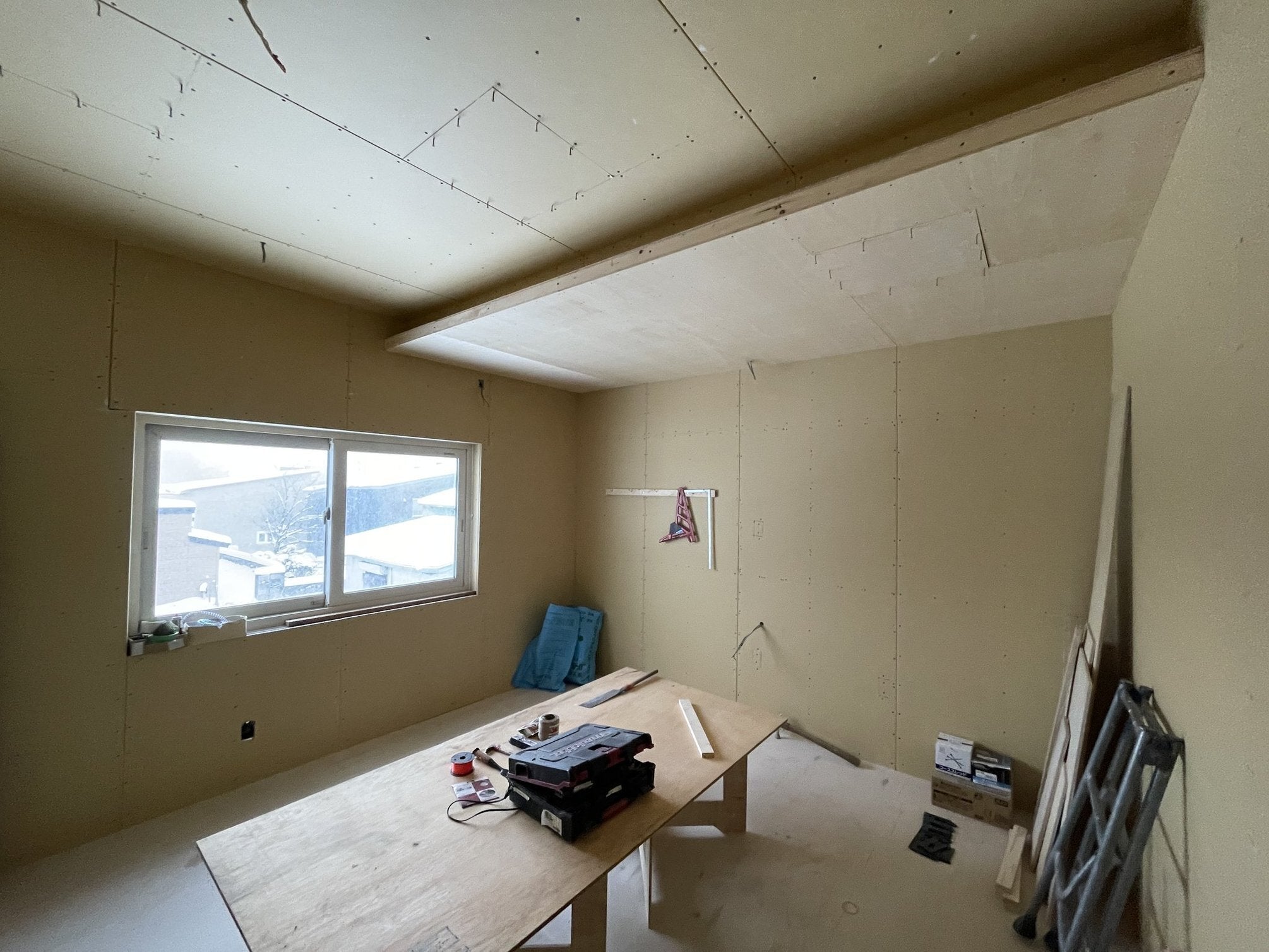 現在は1階奥の増築部分の内装を解体が一旦終わって、3階シェアオフィスの内装仕上げに向けたパテ塗り(石膏ボードのビス穴や繋ぎ目を埋めて平にする作業)を行なっています!