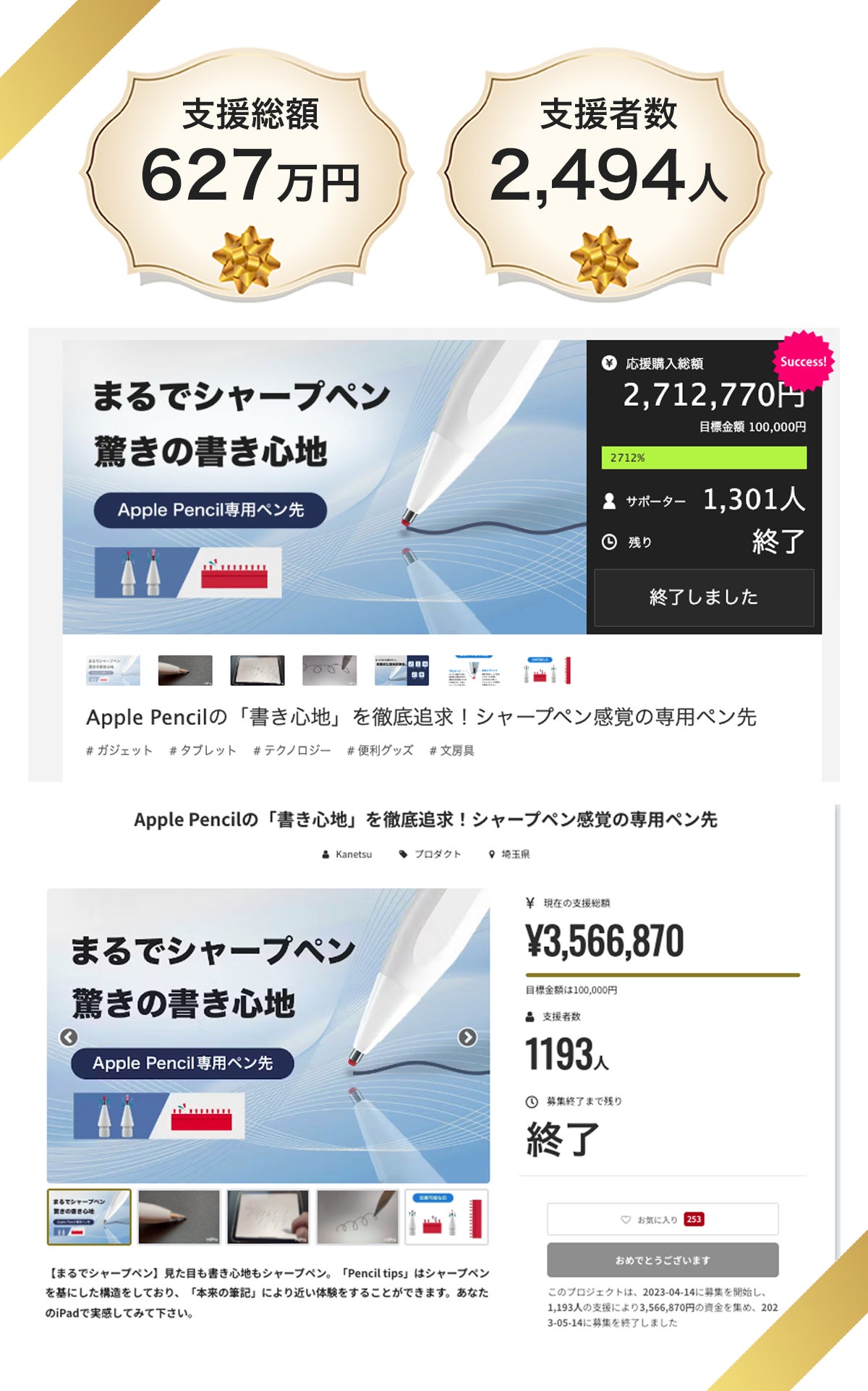 第一弾「pencil tips」は627万円、2,494人の支援者を集めることに成功しました!