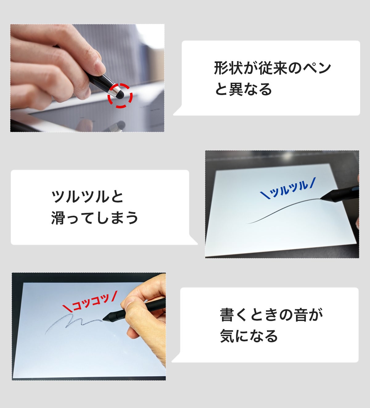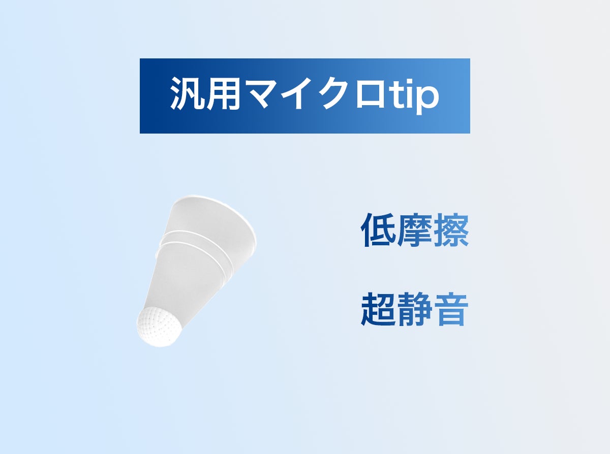 ※「従来の書き心地」とは、私たちが書き慣れているシャープペンやボールペンでの筆記により近い書き心地のことを指しています。そういったペンと形状が同一なことで書きやすい、低摩擦でツルツルと滑りにくい筆記を行うことができるという意味です。
