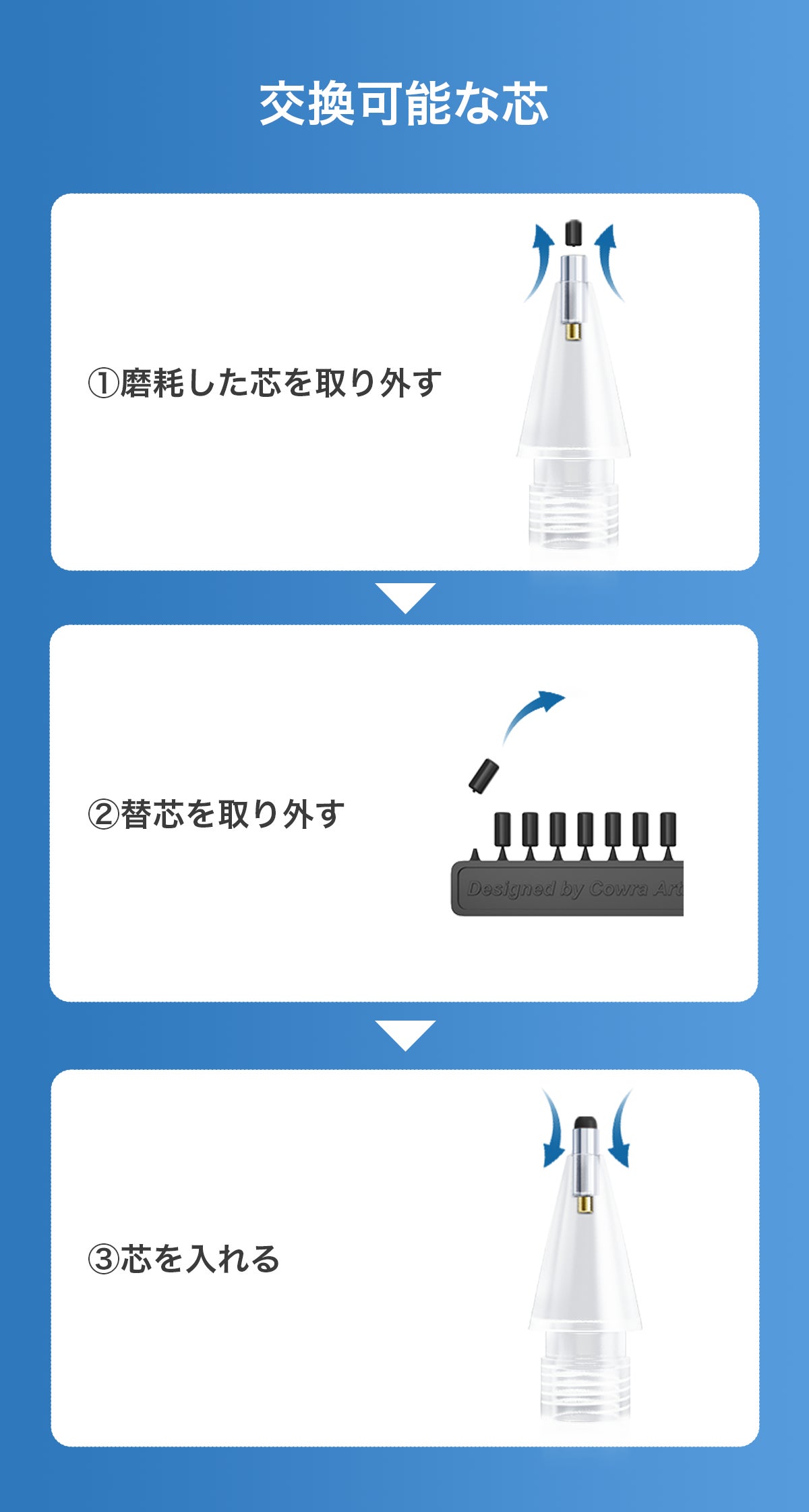 ※芯は爪やピンセットを使って引き抜く必要がございます。摩耗しすぎると、抜きづらくなりますので、お早めに交換してご使用ください。