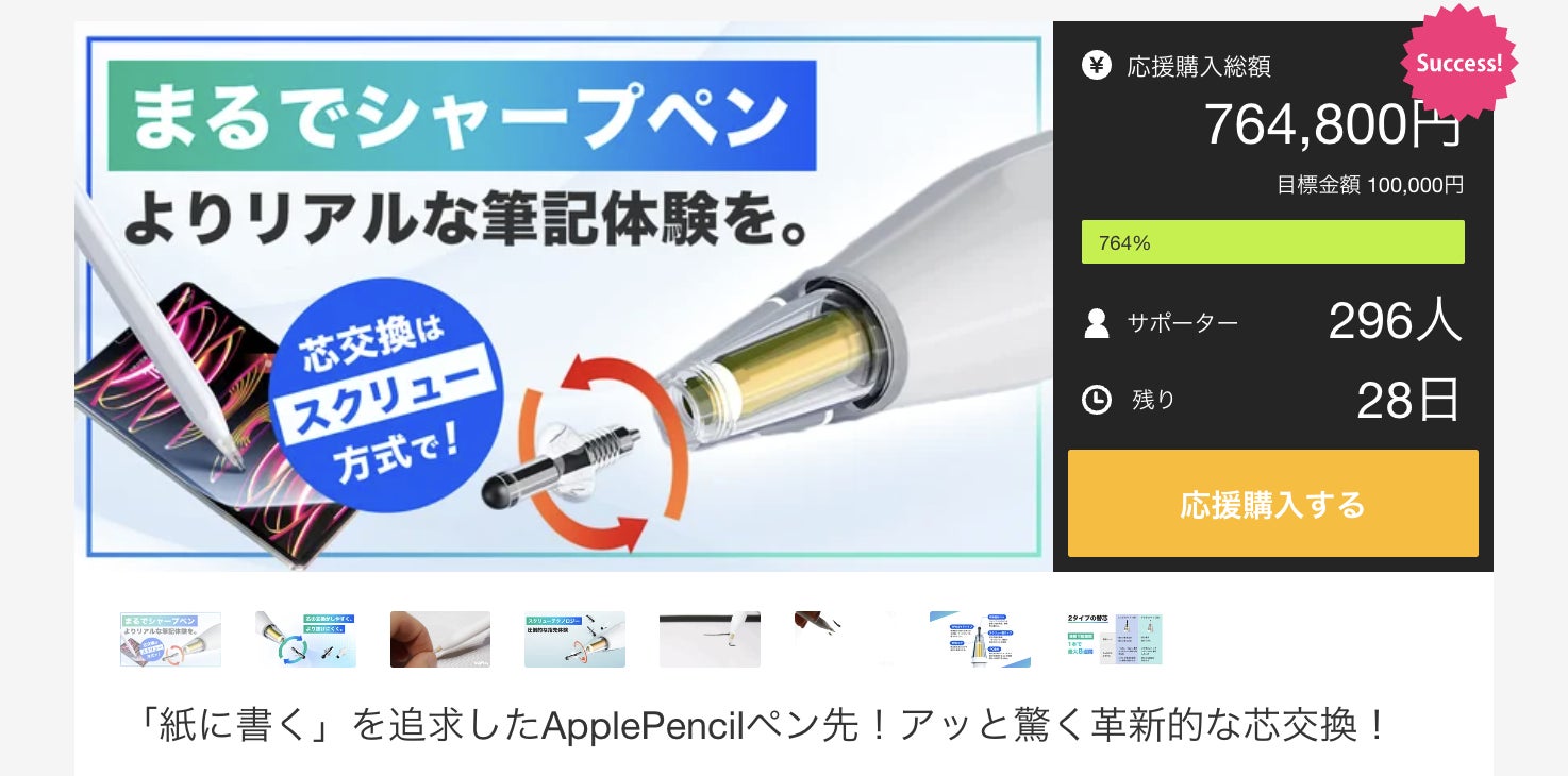 2024/04/21 09:41↓今なら!お得に購入できます↓https://www.makuake.com/project/pencil_tips_screw/お世話になっております。4月19日から新型Apple Pencilペン先プロジェクトを開始しております。現在、わずか2日で764,800円、296人からの支援をいただきました^^お得なプランも残りわずかになります。お悩みの方がいらっしゃいましたら、お早めに購入いただければと思います。引き続きどうぞよろしくお願いいたします! もっと見る