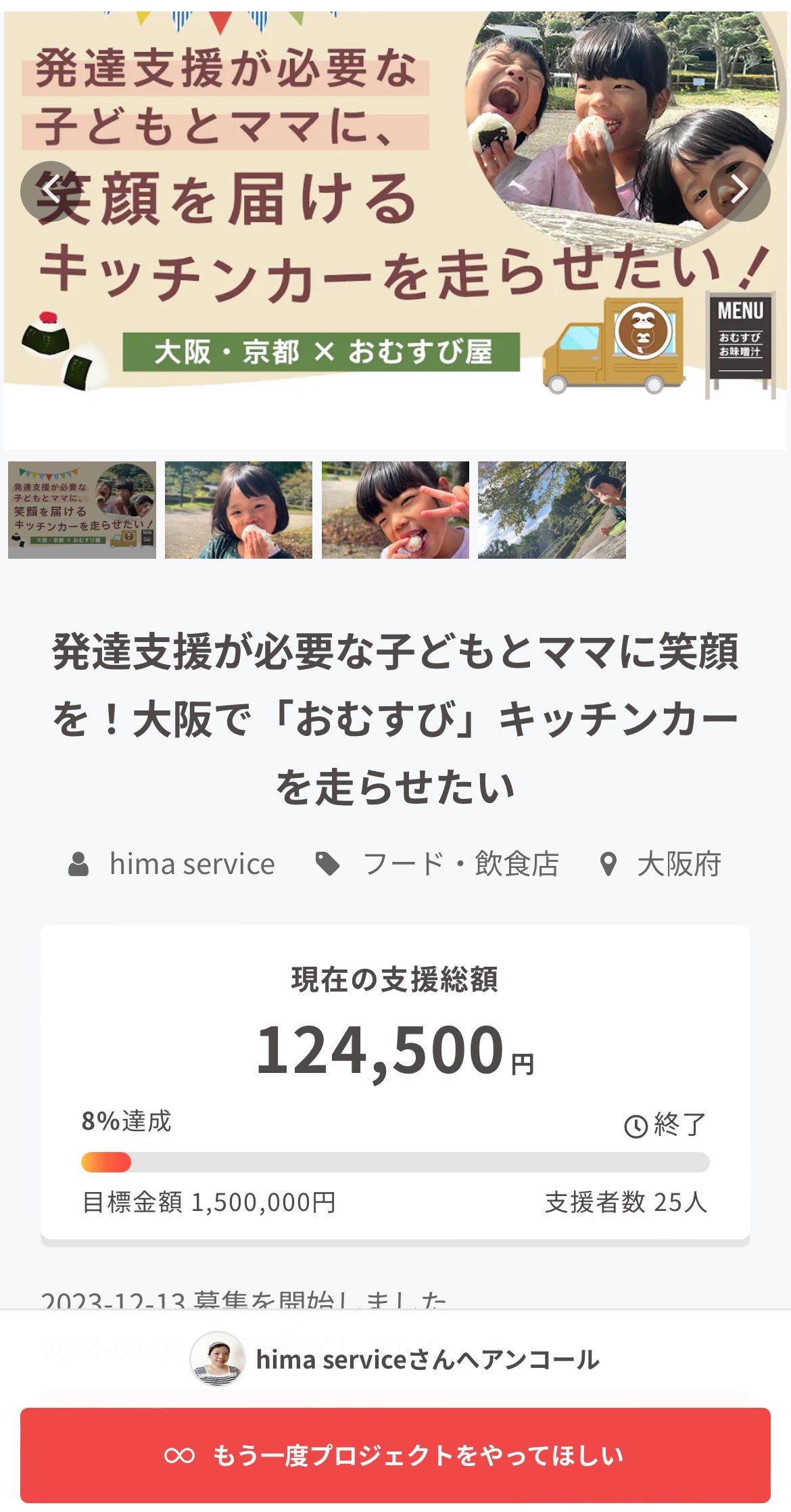 2024/02/04 10:132ヶ月走り抜けたプロジェクト。皆様、ご支援・応援ありがとうございました。1人ずつお礼をお伝えしたいのですがそういう訳にもいかず、、、。皆様が色んな方法で情報をシェアしてくださったこと本当に本当に嬉しかったです♡私のことを知ってくださっている方このプロジェクトで繋がった方ご支援・ご協力くださった方色んな出会いに感謝しております。今回は達成できませんでしたが色々お話ししている中で「絶対必要なもの」だと改めて感じましたのでレンタルキッチンカーで経験・勉強をしながらまたクラウドファンディングをして皆様に頼るだけではなく自分や家族の力も借りていつか達成したいと思います◎また、こども食堂等で「おむすびの日」的なのを設けていただき子ども達や家族の笑顔にも触れていきたいと思っています。これからも夢に向かって進んでいきますので見守っていただけると嬉しいです(*ˊ˘ˋ*)皆様、本当にありがとうございました。 もっと見る『最後のお願い』