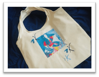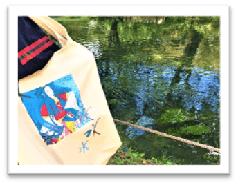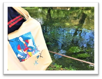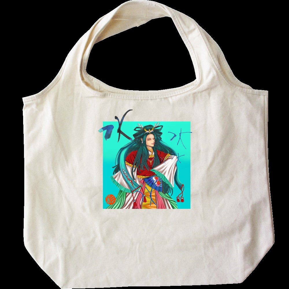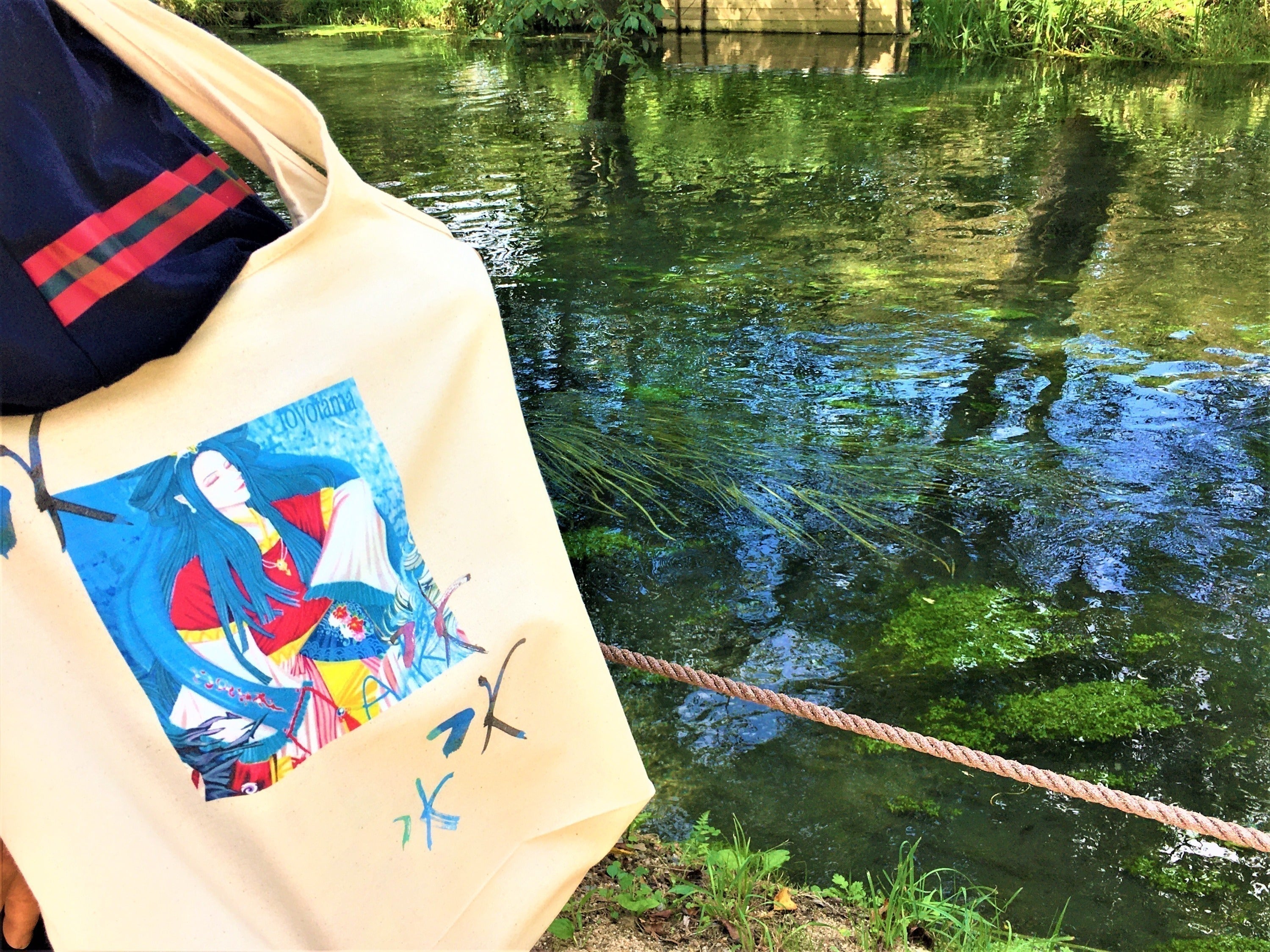 この作品は、イラストレーターayaの安曇野みずもりに安曇野市女流書家でもあり日展作家の友人が娘へのエールとして「水」を書してくれたものをトートバッグにしました。