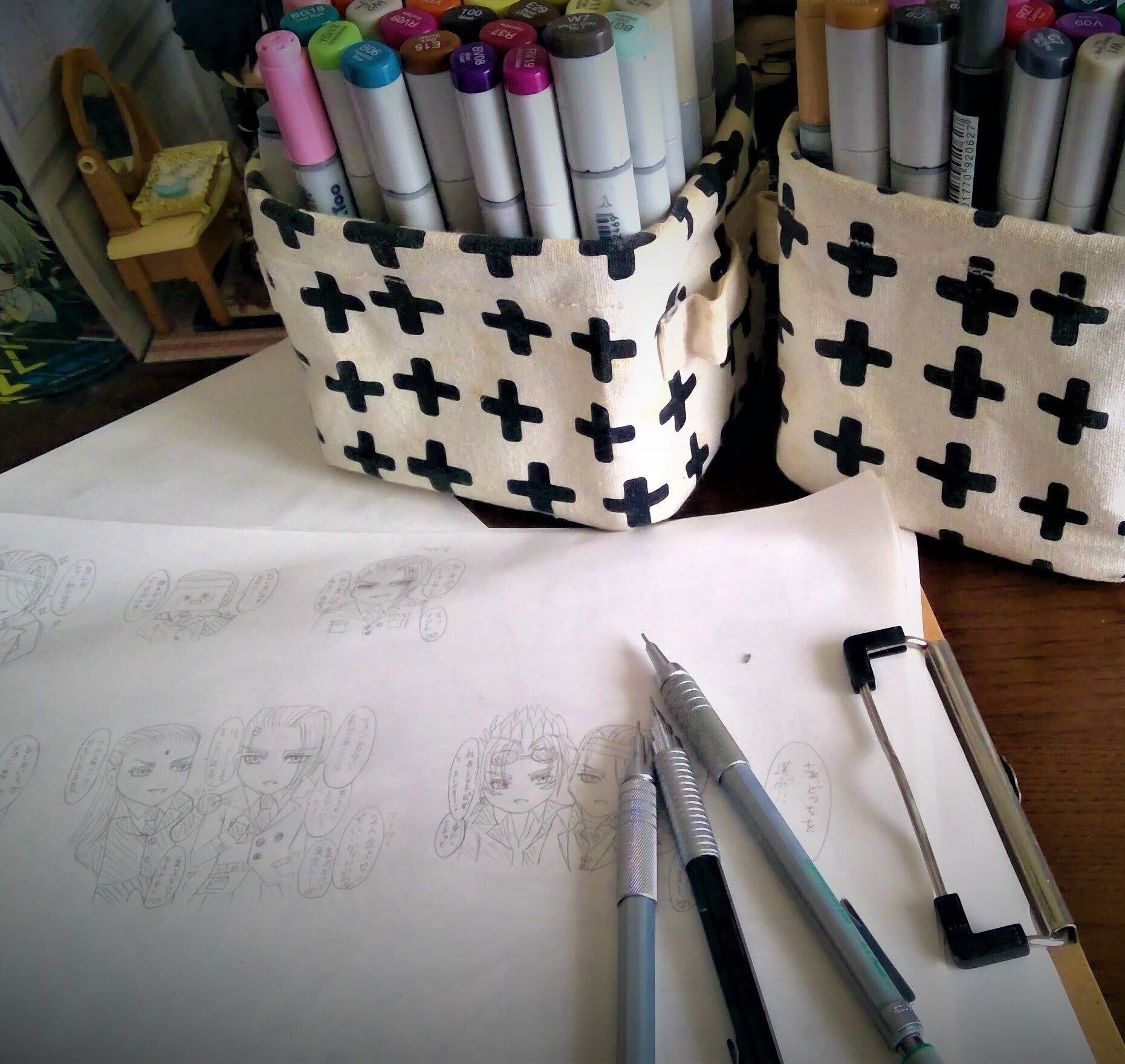 毎日活き活きとした彼女の姿はわたしの張り合いでもありました。わたしまでいつの日かアニメ好きになっていきました。下書きは製図用のシャーペンを使用し、塗りはコピックという多色のペンを使い、繊細な色のグラデーションを創っていきました。すべて独自で生み出しています。自由という環境が最も彼女に適していると感じたので、彼女の独自の想像性を尊重しようと、専門校を薦めることはやめました。そしていつしか、オリジナルの作品を描けるようになりました。今でも、彼女のデスクにはA4の用紙がバインダーに挟まれています。
