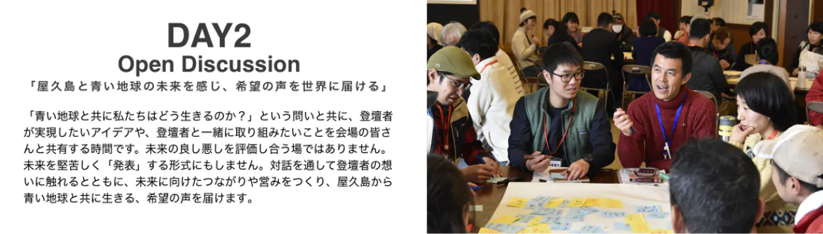 そう信じて、島内・島外のコミュニティを超えて、地球と共に生きるみなさんを屋久島に集め、屋久島と地球の未来を語り合い、新たなつながりや営みを生み出し、世界に希望の声を届けます!