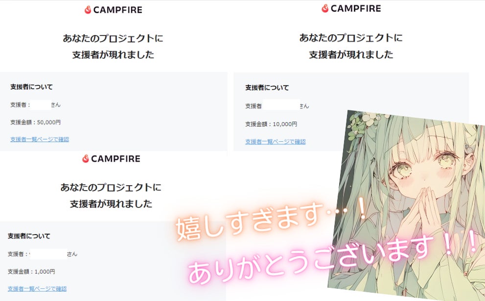 三名の方に新たにご支援いただけました!しかも高額プランまで…!!ありがとうございます♡ ̖́- (中には二回目のご支援してくれた方も居て、本当に嬉しいです。)
