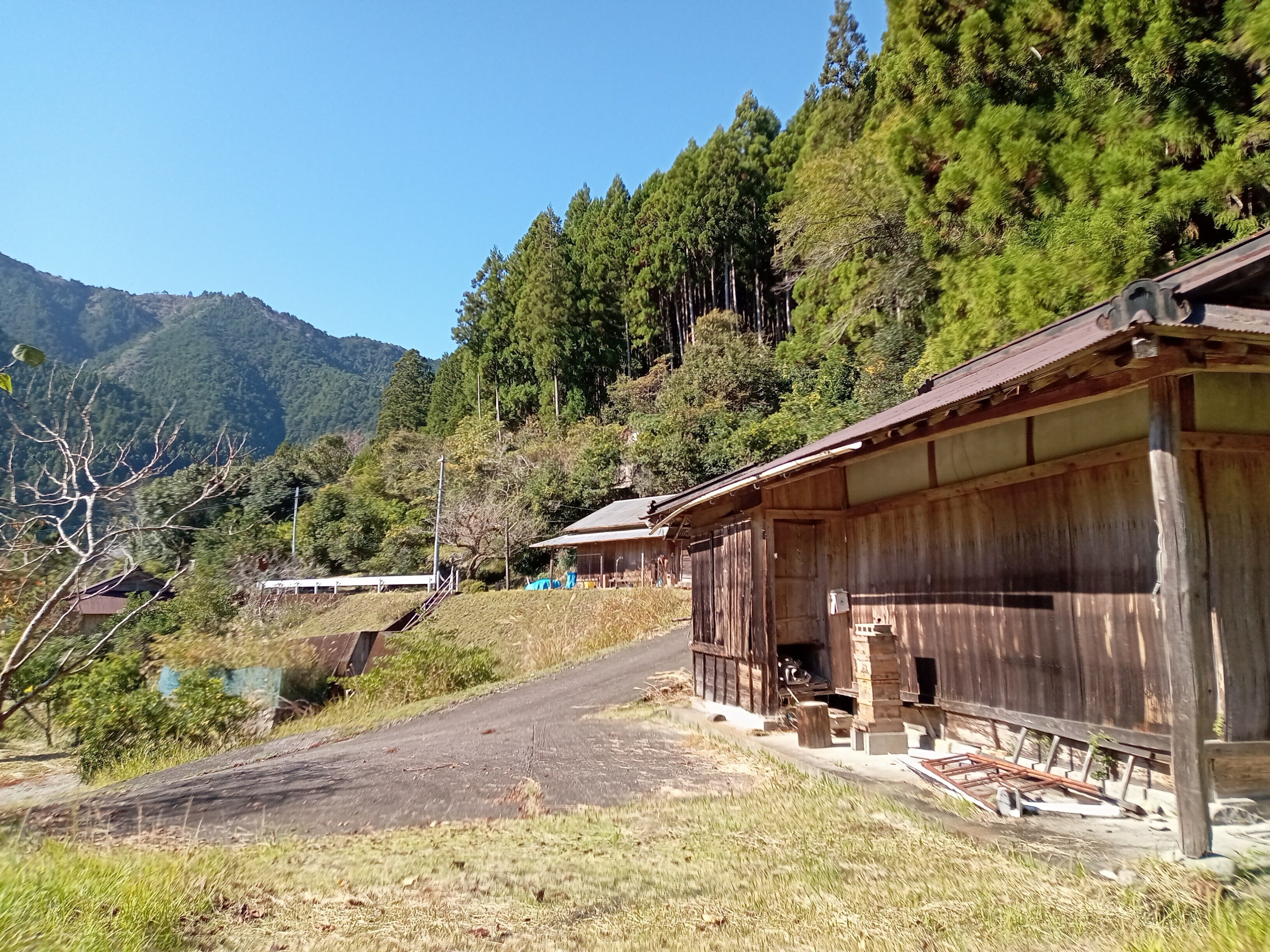 写真中央の家も、一人暮らしだったおばちゃんが亡くなって空き家になりました。生前から県外に住む息子(私の幼馴染み)が年に数回帰省しては草刈りなどしています。写っている他の三軒も全部空き家です。