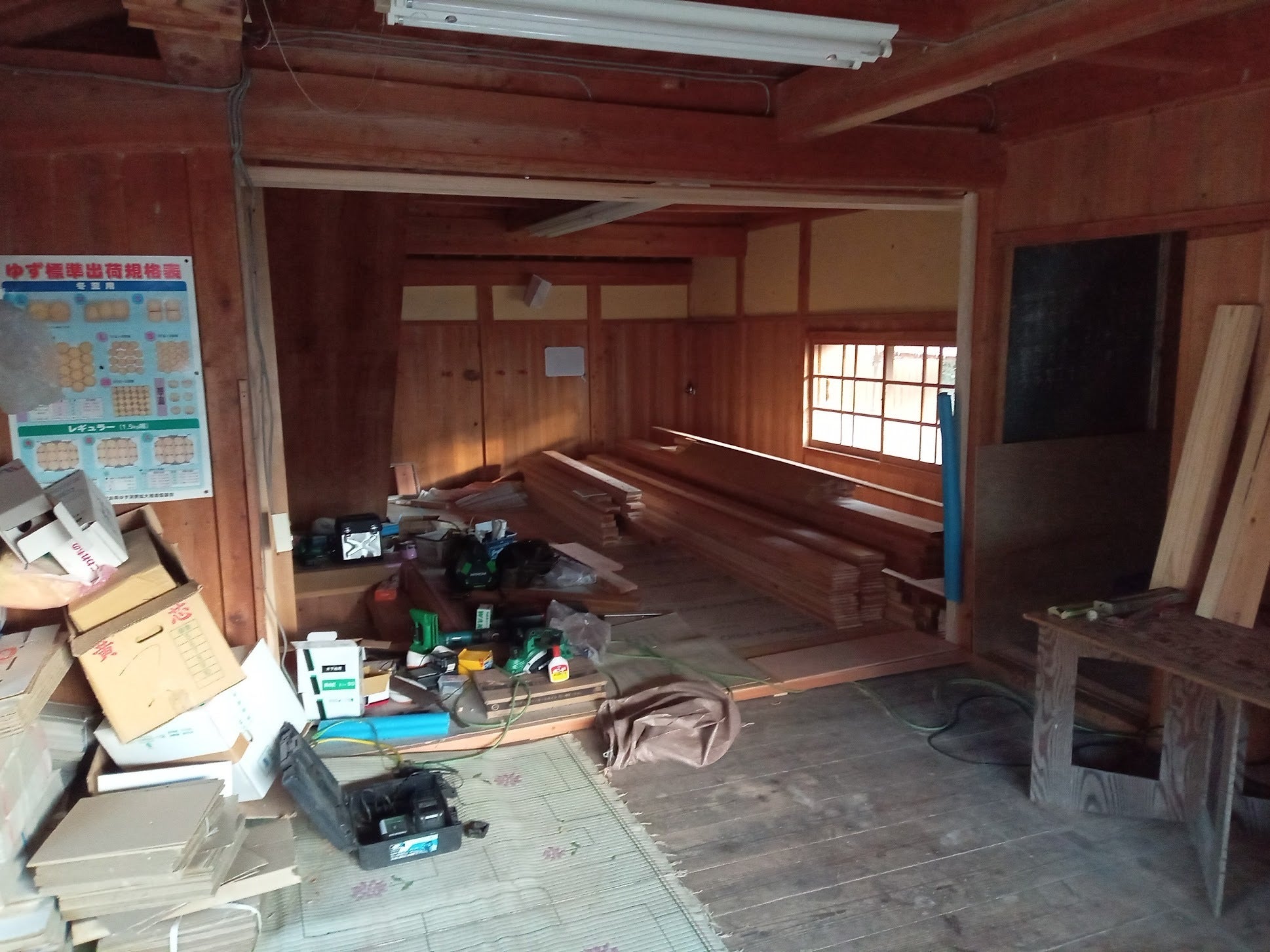 納屋一階の工事(手前の柚子選別作業場は畳敷きになります。)