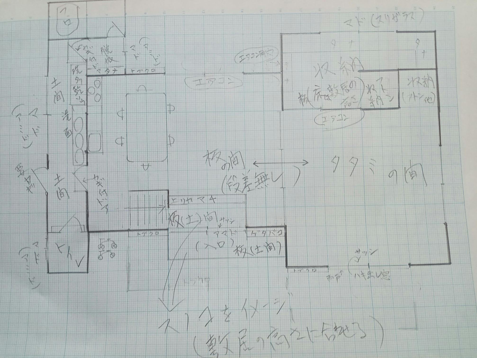 一階は、流し台と調理台の有るおよそ10畳の板の間と8畳の畳敷きのスペースにします。