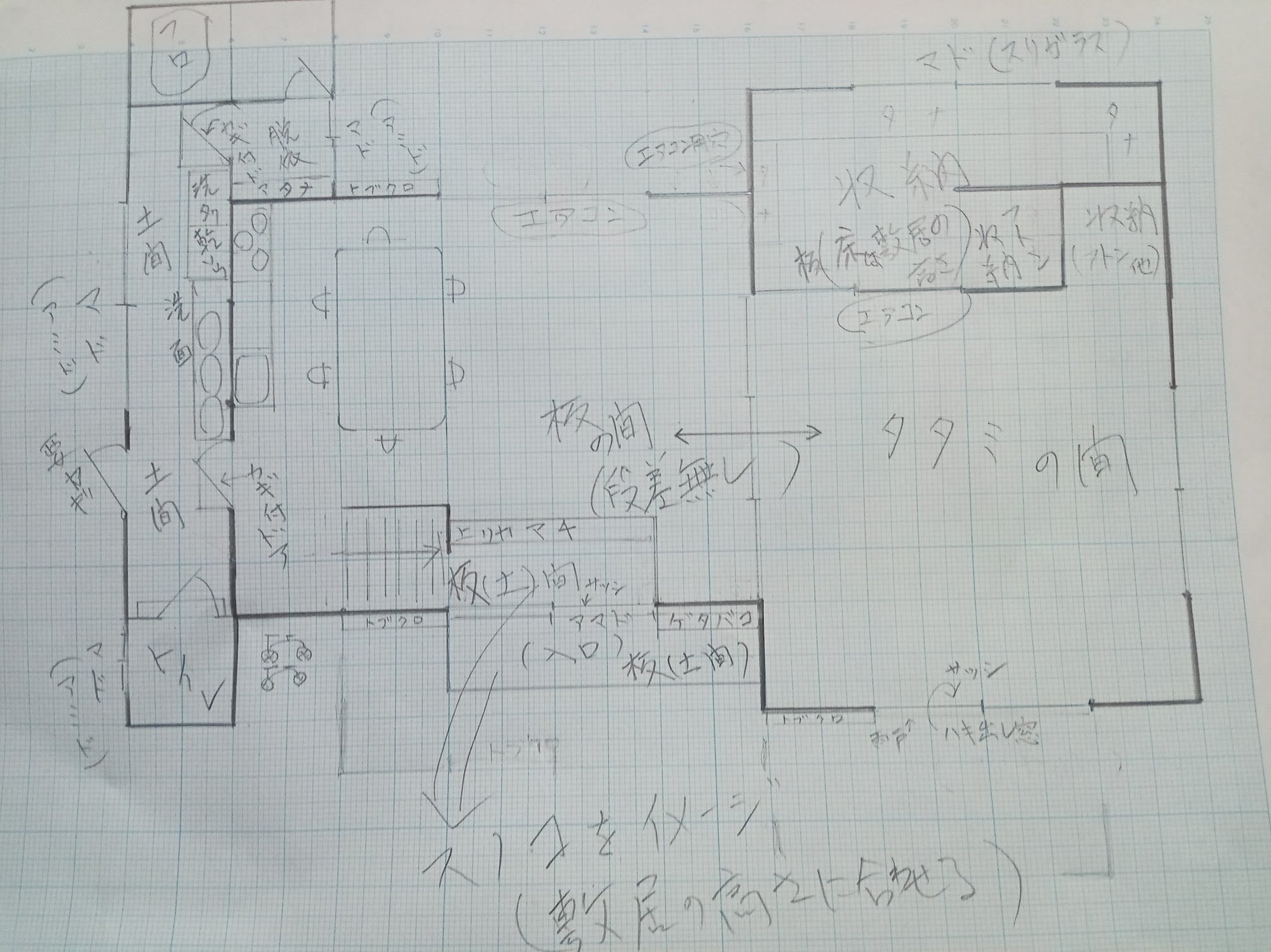 一階は、流し台と調理台の有るおよそ10畳の板の間と8畳の畳敷きのスペースにします。