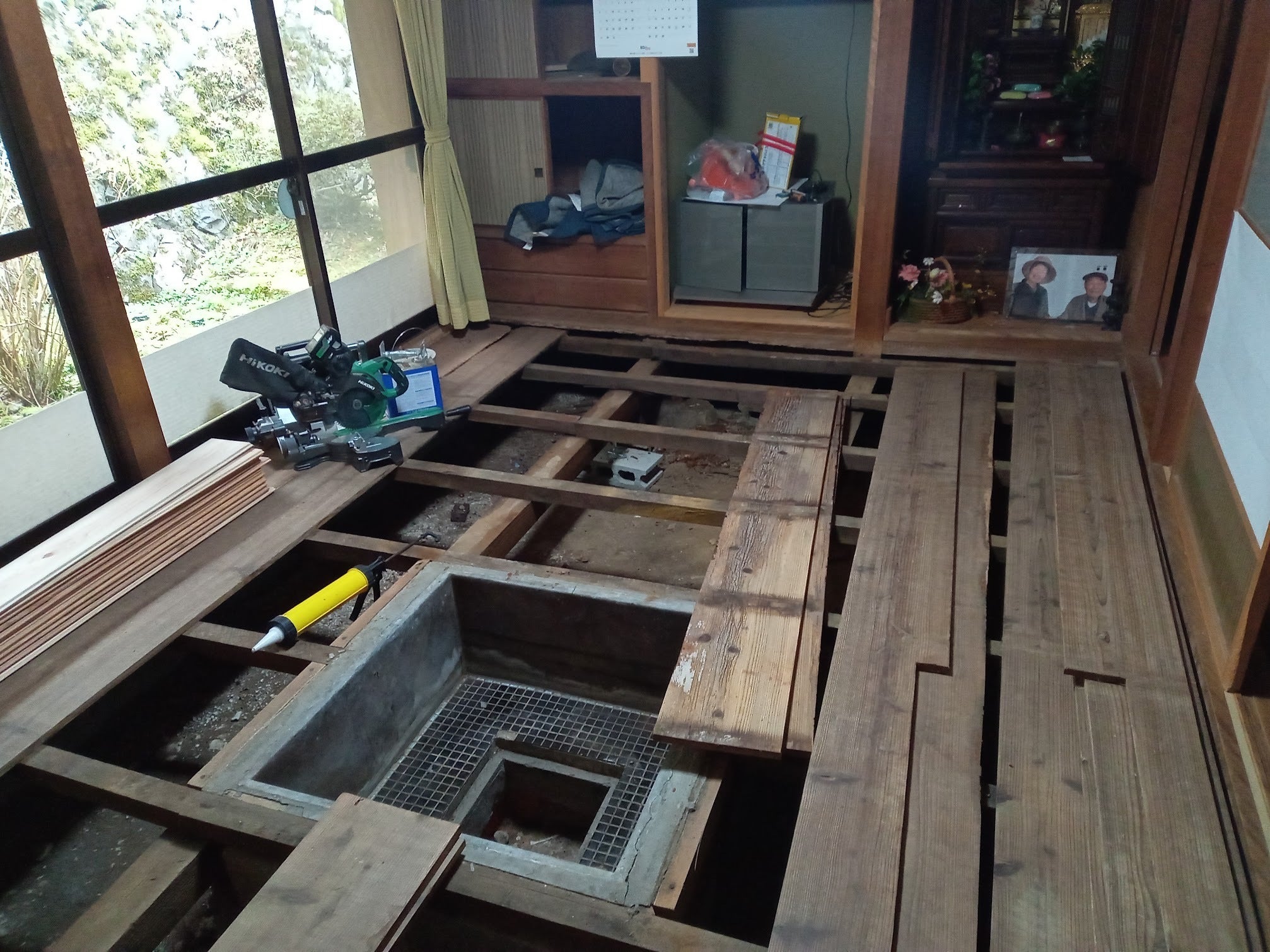 大工さんによる修繕の様子(掘り炬燵の跡)