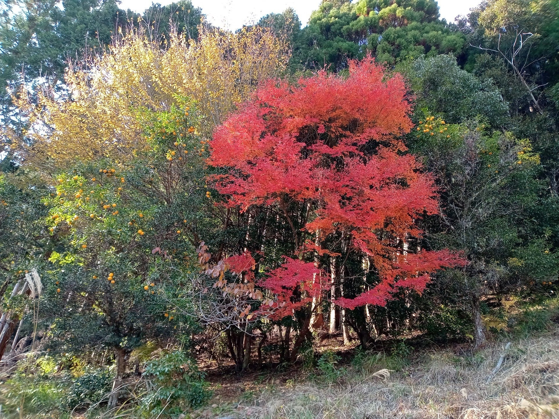 裏山の実生柚子と紅葉