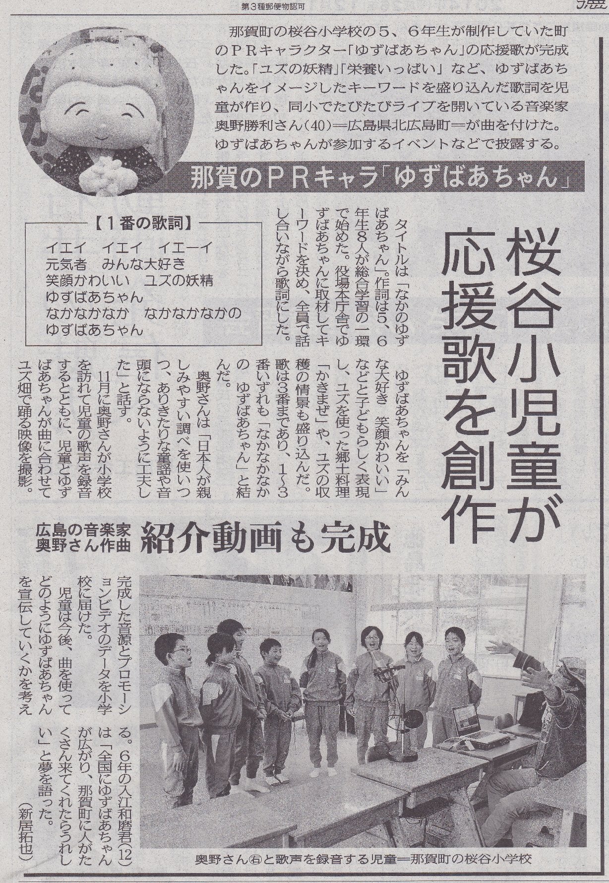 地元新聞に下の記事が載る数年前から毎年、奥野勝利さんは小さなバンに電子ピアノや機材を詰め込んで、その隙間で寝起きしながら那賀町水崎字水崎原の桜谷小学校へやって来て、音楽の楽しさを子ども達に伝えてくれていました。
