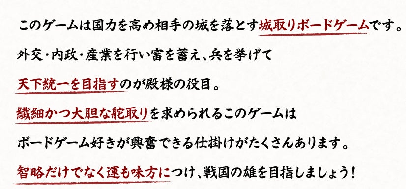 戦国の一大名として天下統一を目指せ。他の大名の動向を伺いながら、力や資源を蓄え相手を攻め落とそう。同盟も裏切りも交渉も制限なし!状況に応じた最善手を見つけ、勝負を仕掛けていこう!有名武将も多数収録!