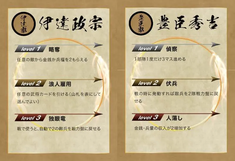 それぞれの武将にはレベルごとの能力がついており、武将カードを使用することで敵の部隊を戦前に減らすことができたり、城を強化し防衛力を高めたりすることができます。他には、戦場での行軍速度を高めたり、敵に攻城戦を有利にすることができる脳梁を持っています。