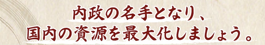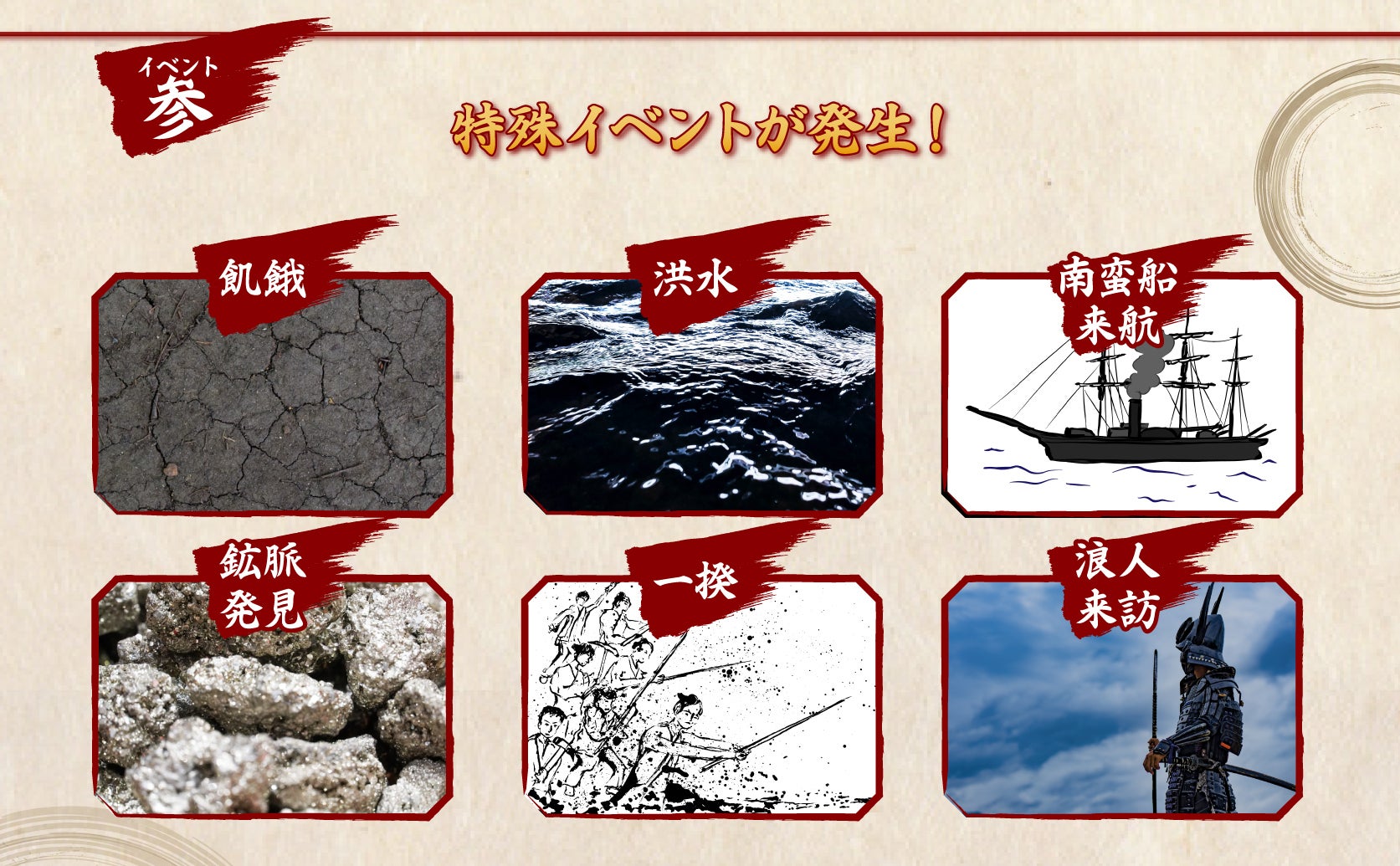 飢餓、洪水、南蛮船来航、鉱脈発見、一気、浪人来訪など、迫り来るイベントをうまく潜り抜け、天下統一への足掛かりとしましょう!