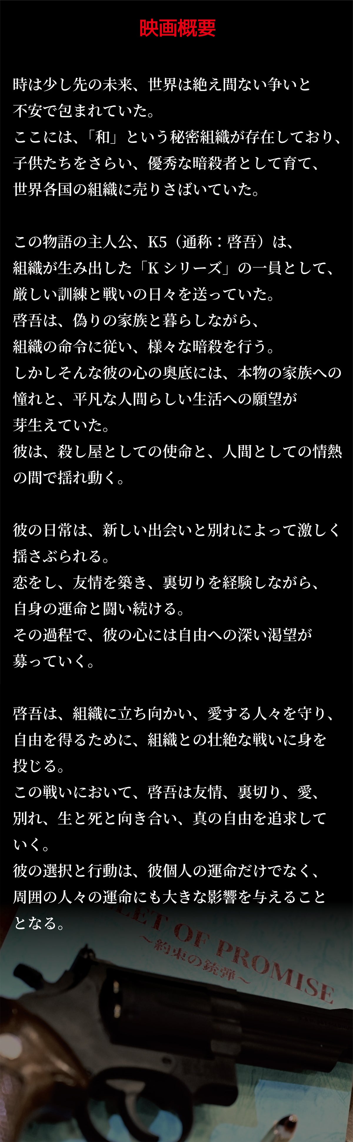 皆様、この度は今作のクラウドファンディングに参加していただき、本当にありがとうございました。 10代最後の作品としてこの作品が残せたこと。自身初長編映画がこの作品であった事が、本当に嬉しく、幸せな気持ちでいっぱいです。 さて、この脚本を本作の脚本監修である園田英樹先生。僕の学校の先生でもあり、古くから数々のアニメーション作品で脚本を手掛けてきたレジェンドでもあります。 そんな園田先生と僕が脚本のお話しを始めたときは、まだ18歳でした。そこから19歳の初め頃、共同脚本として参加してくださった桐山瑛裕さんを交え脚本が完成致しました。 園田さんと桐山さんは、僕の意見をとても尊重してくださる方でした。 なので、命に対する考え方や尊さや、19歳から20歳という大人になるための準備や心構え。 そして、【大人になるということ】に対する、僕なりの答え。その全てがその作品の中に込められているのかなと思っています。 ですがその分、この脚本には僕の青さや未熟さが出たとも言えるでしょう。 そして撮影が始まった19歳の夏。 そして19歳の終わりである、2024の初め頃、未撮影シーンを残して一旦のクランクアップとなり、本当に全ての撮影が終わったのは20歳の終わり頃でした。 その間、学校の課題に追われたり、様々な映画にご縁があって出演させていただいておりました。 ですがそんな中で、僕は様々な方からの演出を受け、学校で脚本というもの、そして【人の心】についての勉強を重ね、演出する立場としての成熟を重ねていきました。 そして、20歳の終わりから21歳になってすぐの編集が終わるまでの間で、僕はやっと長い年月をかけて自分自身の作品が客観的に見れる演出家としての目を養い、本作と向き合いました。 その結果、撮影した後削ったシーンや回想に回したシーン、追加した台詞や削った台詞等、沢山の変更点が出てきました。 それでもその変更全てに満足がいっているわけではありませんが、僕はこの作品の中で、自分自身が19歳~21歳の中でどう演出が変化し、考え方が変わっていったのかが、手に取るように分かります。 人生にとって一番心情に変化が現れ、成長が見られるこの19歳~21歳という期間。 そして、この世の中決して同じ考え、同じ人生を歩む人間などおらず、僕だけにしか存在し得なかった19歳~21歳への変化。 それがこうしてひとつの作品のなかに混在し、映画という2時間芸術の中に全て存在しているという事はあらためて素晴らしいことだなと感じ、より一層皆様への感謝が強まっていきます。 そんな脚本と本編を見比べながら、僕自身の青さと、その成長を感じ取ってくれましたら嬉しく思います。 改めまして皆様、僕の人生の成長を僕と共に見守る一人となってくださいまして、本当にありがとうございました。 是非、これもひとつのエンターテインメントとして、楽しんでくださいましたら嬉しいです。