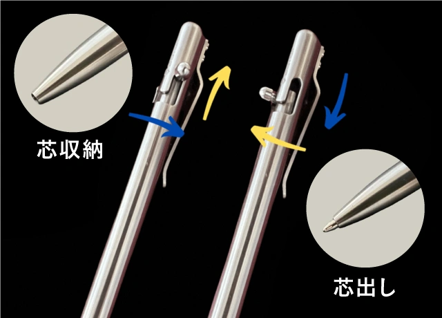 A-2. 「ボルト」を操作して、リフィル(芯)を出し入れする際、「ガチッ」、とチタンとチタンが触れる、気持ちの良い、小さな音がします。