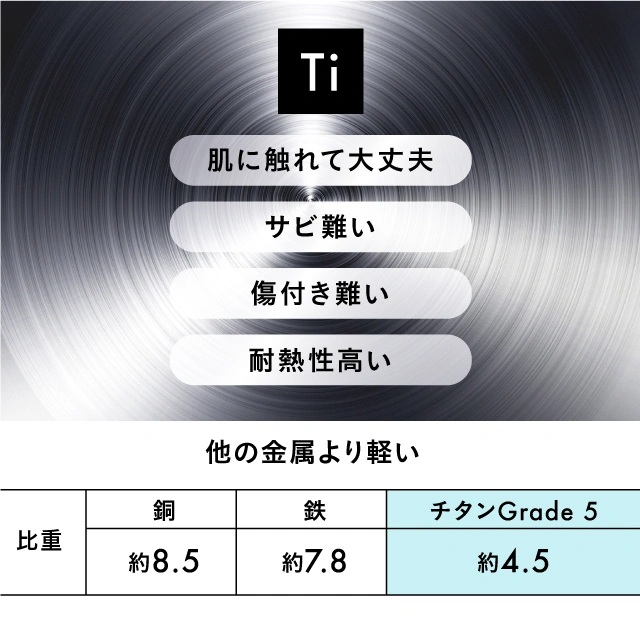 ❸ 全身が非常に硬いチタン・Grade5。劣化しにくく、耐久性抜群!