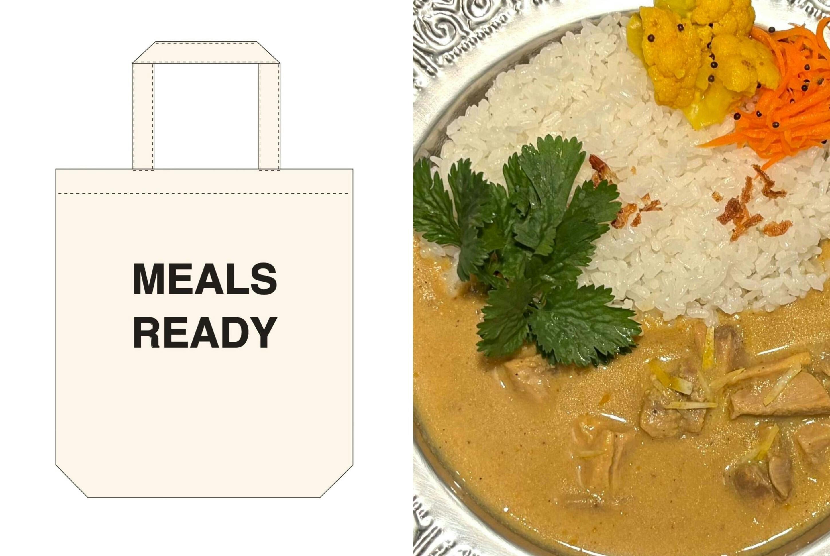 主に南インドでは「OPEN」の意味を指す「meals ready」の看板を店頭に掲げます。その文字を私のファッション業界時代の経験を活かし、手摺りプリントしております。全て一点ものの特製エコバックです。