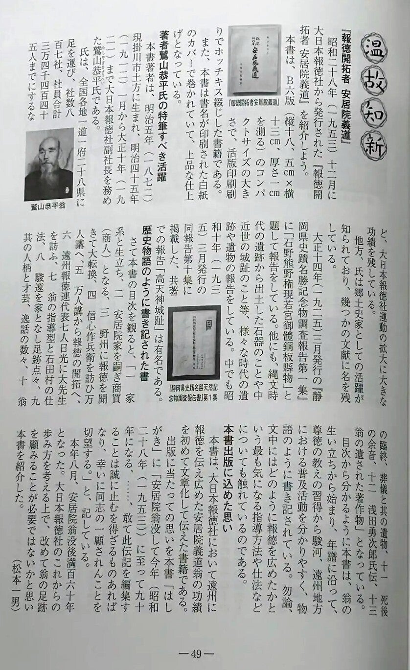 大日本報徳社の「報徳」の表紙と「温故知新」で、原本の鷲山恭平著『報徳開拓者 安居院義道』が紹介されています。