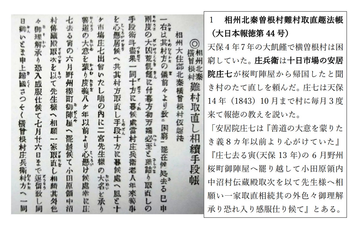 右の通り御拝借被仰付被下置村内一同相助り様々露命を繋ぎ補ひ候段重々冥加至極難有仕合奉存候につき去る酉年より今卯年まで年々割済を以て御返納仕置候へども其未だ村柄取直しの義は十方に暮候処此度庄兵衛取持を以て二宮先生様の御理解を承り一同感心いたし前文の通り人々分限分内を弁へ候て天命に基き候へば貧窮の憂ひを免れ富貴一段の事と相励み農行出精いたし農間朝夕丹精致し或は縄索莚織草鞋其外村為にも可相成義を案外勤行いたし度義に付村中一同連印左之通り