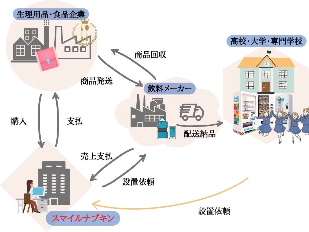 私たちNPO法人スマイルナプキンプロジェクトは、生理の貧困を解決させるため、女学生が自動販売機で生理用品を無料で受け取れるように学校へ導入設置をご提案しています。