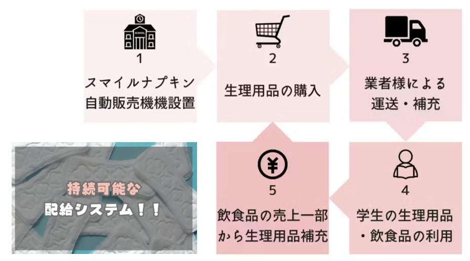 コピー機使用一枚につき0.1~0.5円や自動販売機の飲食品の売上の一部がNPO法人スマイルナプキンプロジェクトへ寄付され、生理用品補充費用へ充てられます。