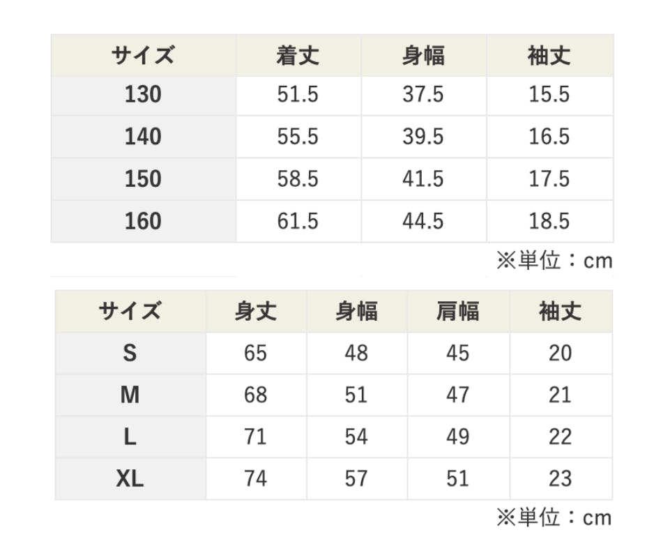 サイズ:130~160,S~XL(サイズ詳細は、下記画像をご参照ください)
