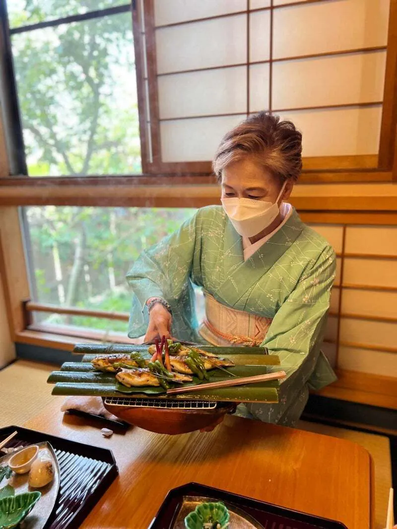 簡単な食事のマナーを学び、生きている鮎を眺めた後は、焼き魚の扱い方を楽しみ、茶道体験もできる会です。