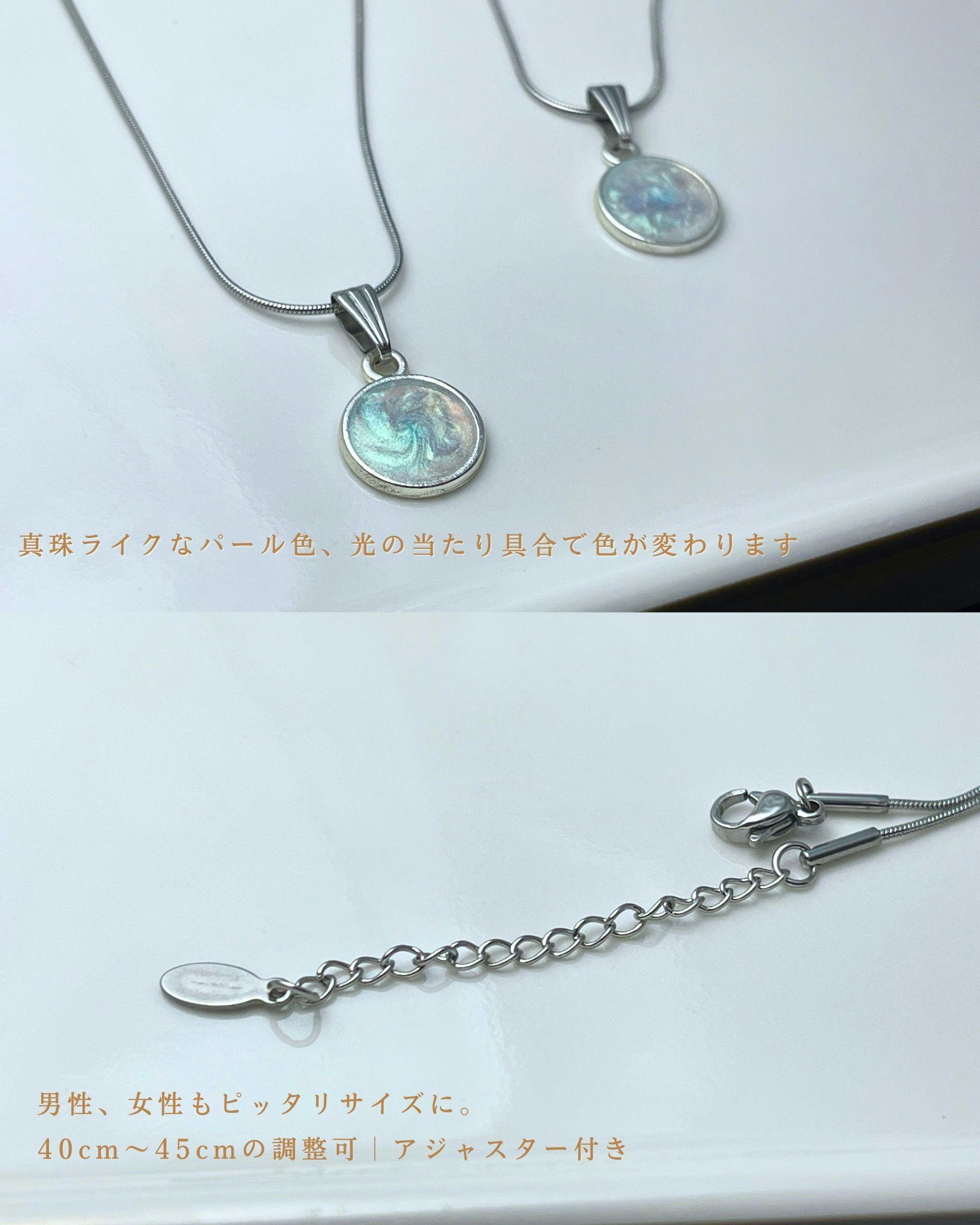 シンプルなシルバー素材に、樹脂製のパールの色合いで、シンプルな設計なため、男女問わず、どなたでも日常使いできる話題のネックレスにになります