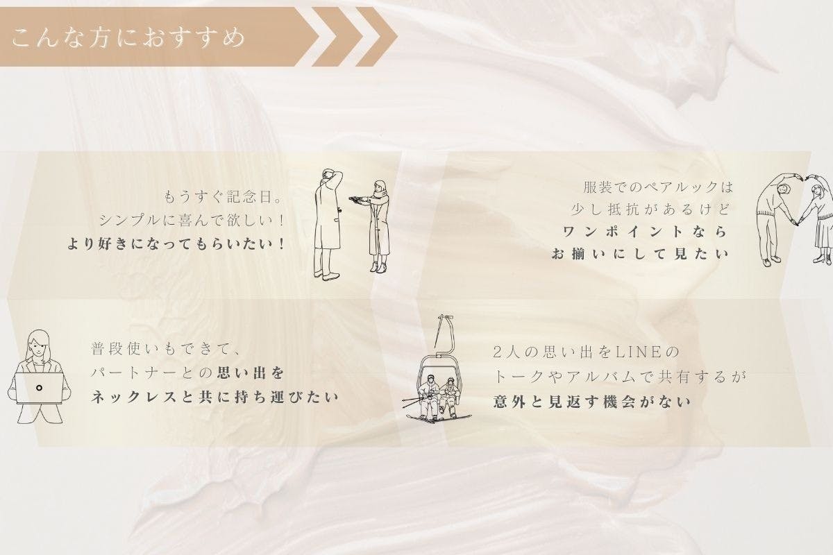 その点、「Ever Links|思い出ネックレス」は、これからも思い出をたくさん作り、共有アルバムとして写真を残しながら、両者がお互いに、あなたとの未来を過ごしたいなどの解釈に変えることができます。