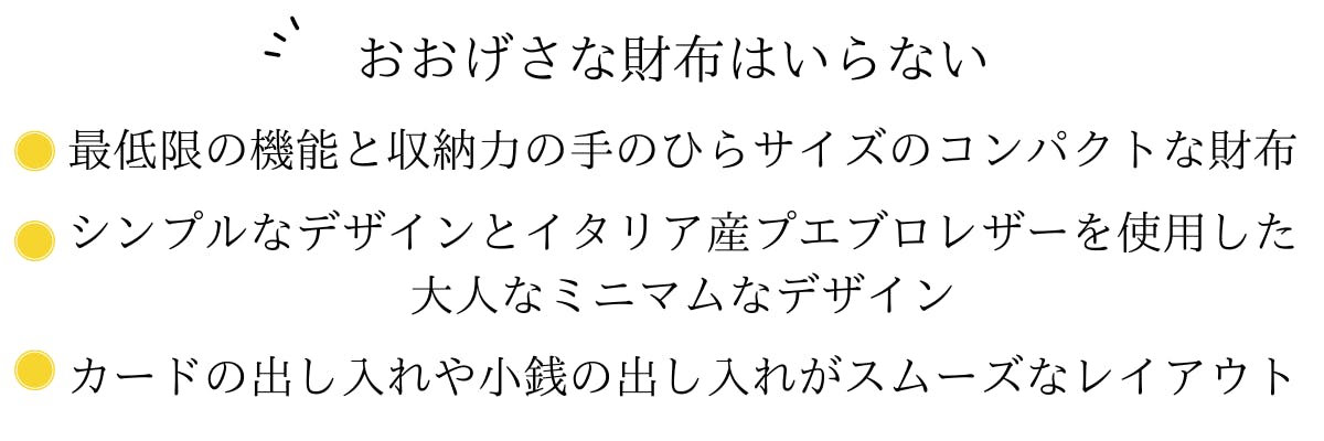 使用頻度によって使い分ける2か所のカード入れよく使うカードはサイドからスムーズに出し入れができます。カード時代にマッチした必要最低限のコンパクトなレザー財布よく使うカードはサイドからスムーズに出し入れができます。イタリア産のプエブロレザーを使用、使い込むほどに経年変化が楽しめます。
