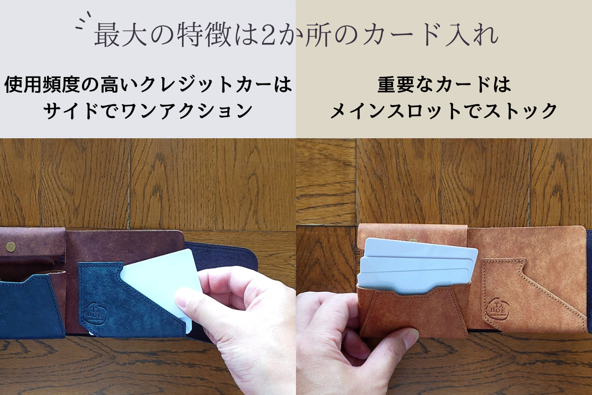 カードの収納を2か所にわけることで圧倒的な使いやすさを実現しました。