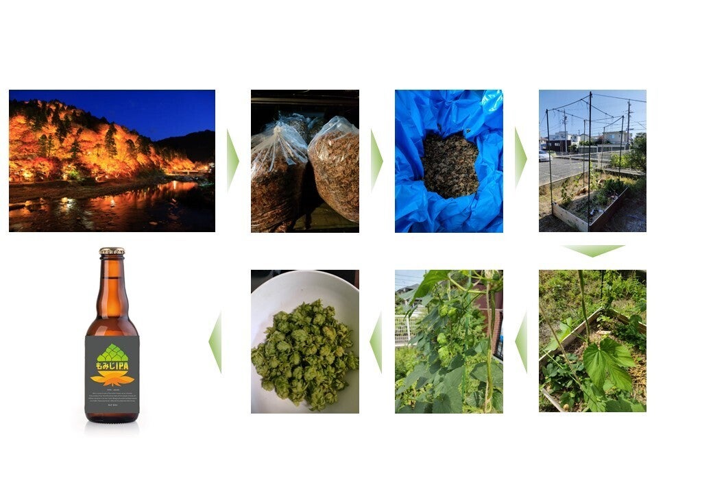 「はじまりApartment」をきっかけとして足助の地元の方々を深く関わり合う中で、香嵐渓のもみじを活用した”何か”を生み出したいと考えるようになりました。「もみじIP.A」は香嵐渓のもみじの落ち葉を堆肥化し、それを100%使って有機栽培した3種類のホップが含まれています。品種はカスケード、ハラタウ、チヌックです。