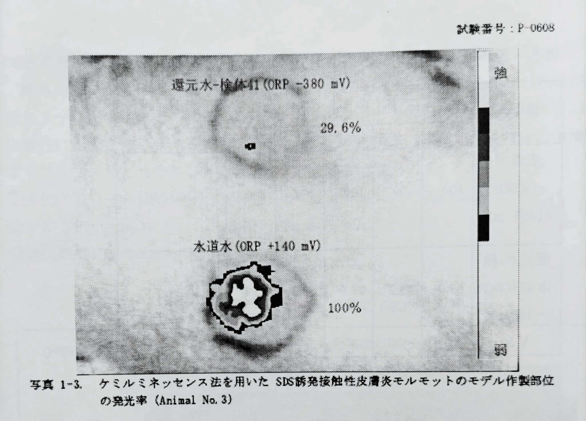 ※ケミルミネッセンス法を用いたSDS誘発接触性皮膚炎モルモットのモデル発光部位の発光率