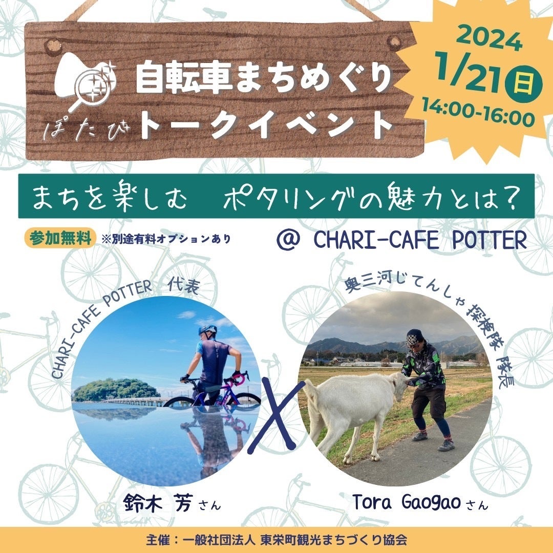さて、今回はトークイベントの開催の様子をお知らせ。ぽたび事業や東栄町のPR、自転車に興味を持つ方の繋がりづくりを目的とした「まちを楽しむポタリングの魅力」というテーマのイベントを開催しました。