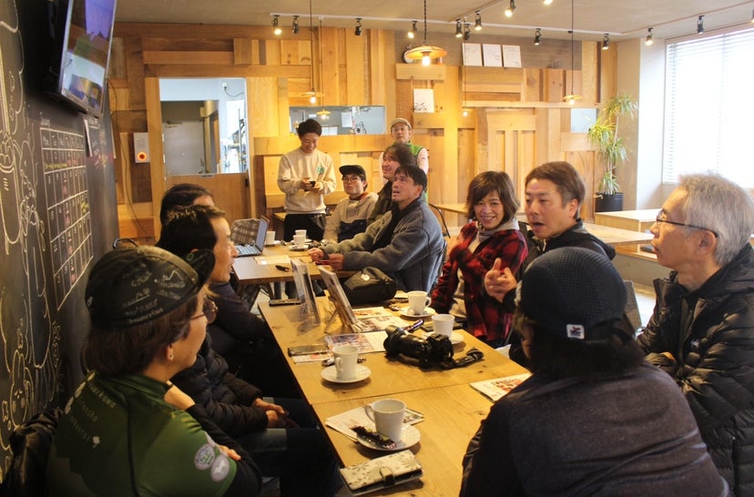 トーク企画前の午前中の時間は、蒲郡の西浦地区をポタリングする予定でしたが、あいにくの天気のため断念しました。…が、店主の鈴木さんにご提案をいただき、ワイガヤ自転車談義をする会を開催しました。多彩なメンバーが揃い、あれやこれやと自転車ならではの楽しみなどを語らいました。