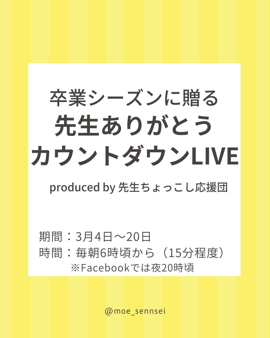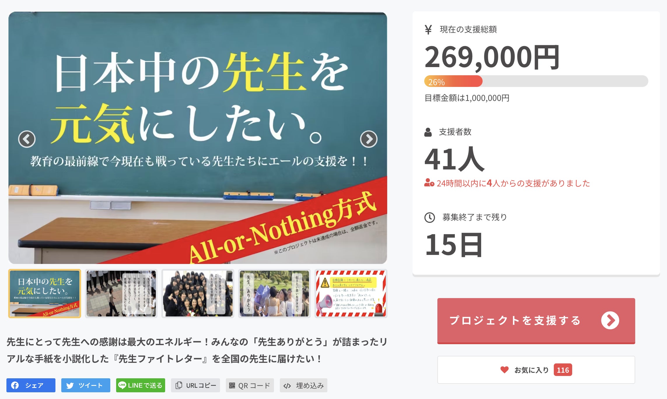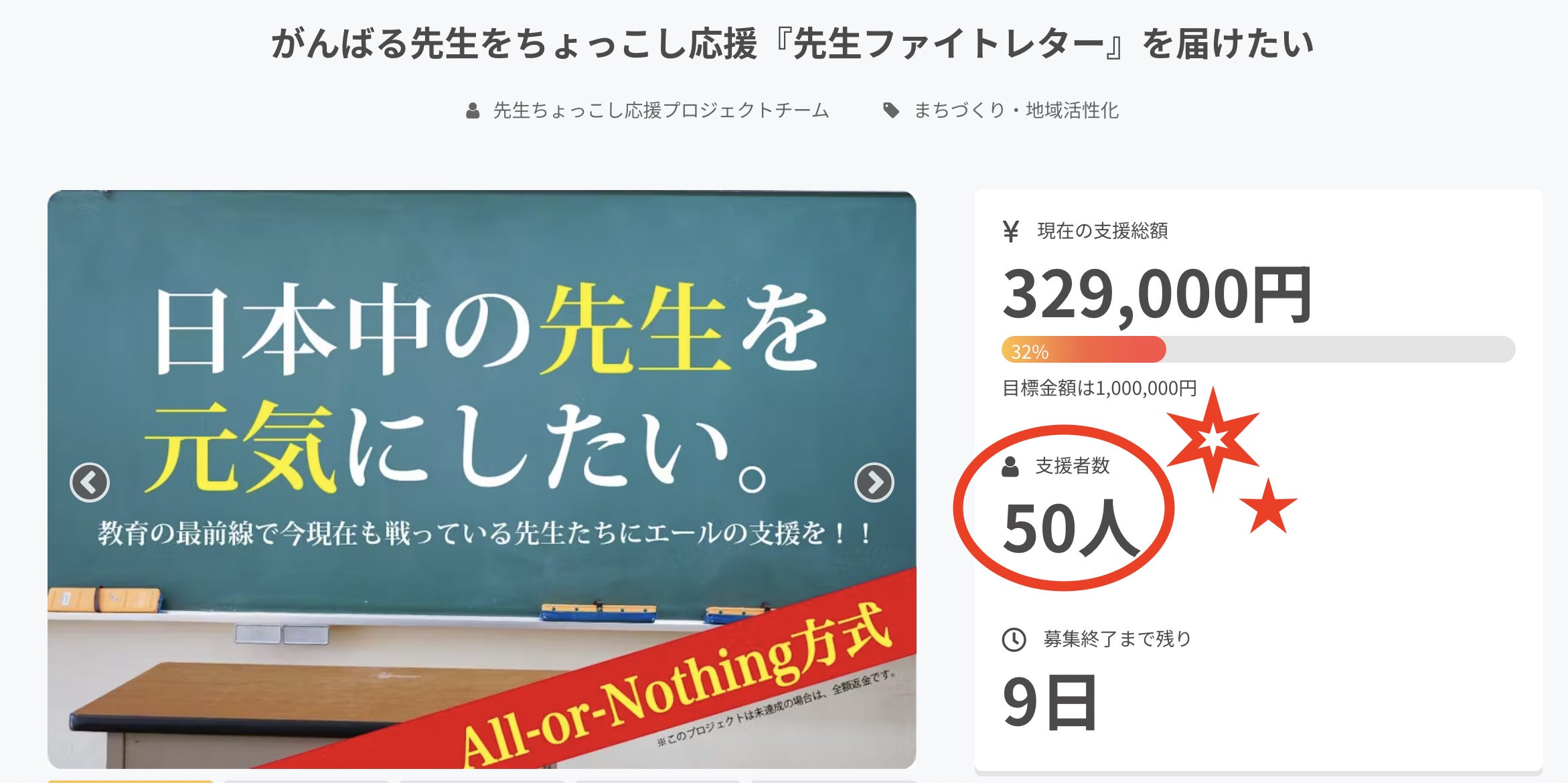 なんと!支援者数が50人を突破しました!!!本当にご支援いただいた皆様、ありがとうございます。今回クラファンをやることを決め、走り初めて、本当に多くのことに気づかせていただいています。中でも、「人との繋がり」についてはとても考えます。「応援してください!」そう言って頭を下げて周り、しかも今回は私には1円も収入としては入らない、完全なる先生を応援するためという目的で行うプロジェクト。そんなプロジェクトに50人もの方が「応援するよ」とご支援くださいました。しかも、こんなピンチな達成率にも関わらず!うまく行っているものにお金を出すことは簡単だけど、どうなるか分からないこの状況を心から応援してくださる。私は間違いなくみなさんが困った時、私ができることで全力で応援したいと思う。お名前が分からない方、ご連絡させていただくので、お名前を教えてください。お一人お一人、どんな素晴らしい方か、私の言葉でご紹介させてください。そして!私がこのプロジェクト立ち上げに至ったには、実は10年前の出来事をきっかけにスタートした昔年の想いがあります。その10年分を話してみない?とチームメンバーが企画してくれた広島弾丸トークツアーを13日(水)にします!ずーっとでなくてもいいので、ふと気になった瞬間、覗いてコメントくれると嬉しいです!1日喋り続けます!(笑)SNSでも告知するので、よかった見てくださいね。みなさん、本当にありがとう!残り9日、「達成しました!」とご報告できるよう、走り切ります!
