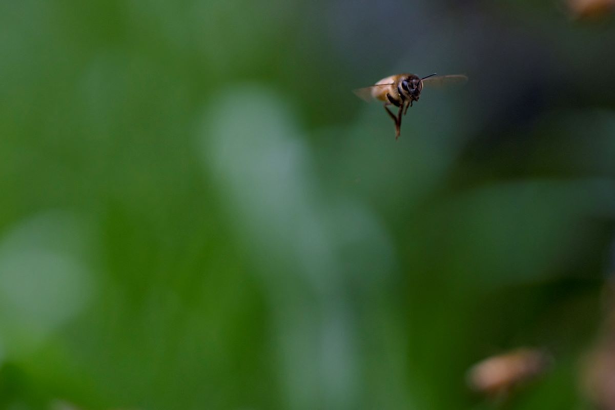 木々の間をすり抜けて、ミツバチが飛び交う森林