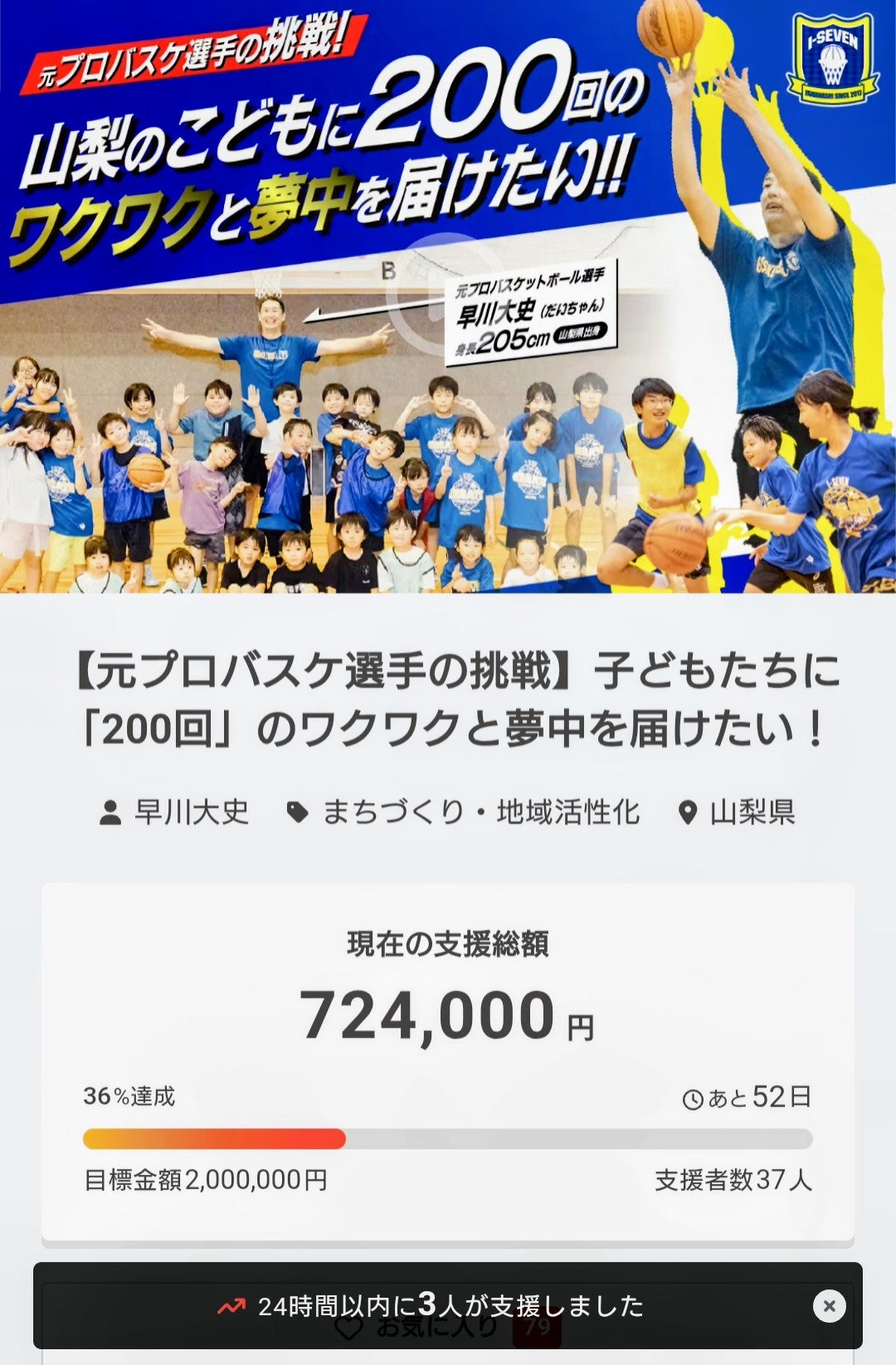 現在挑戦中のクラウドファンディングですが、開始直後に皆様から温かいご支援をいただき、現在37名の方から724,000円(36%)の支援が集まっています。心から感謝申し上げます。