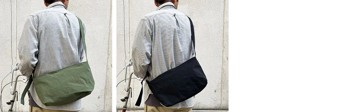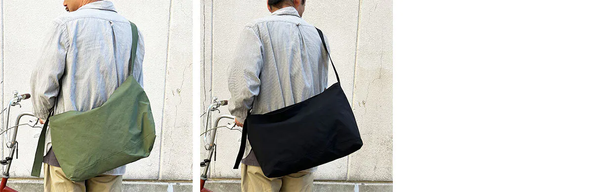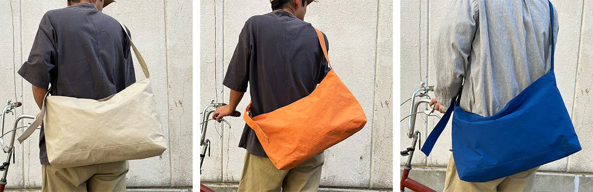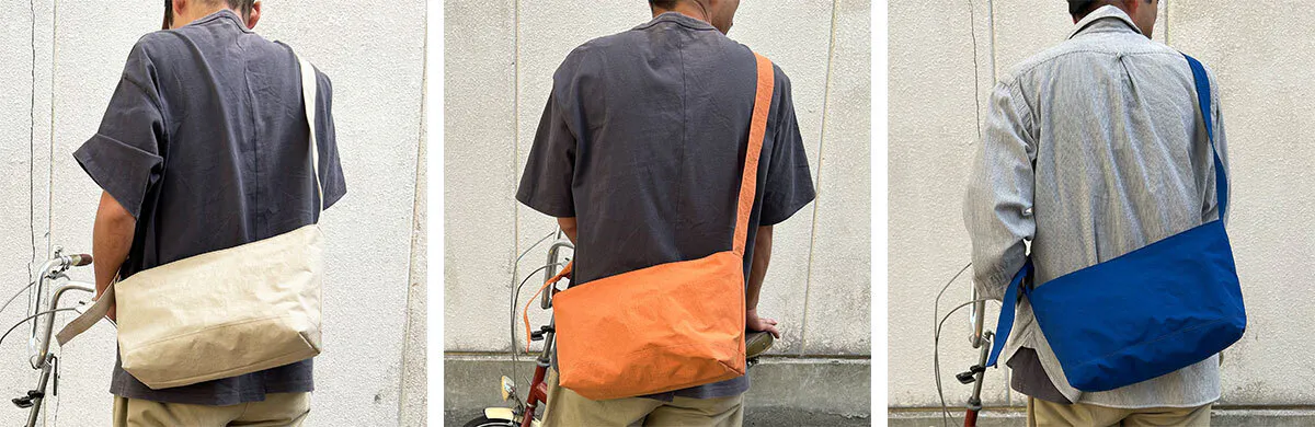 このバッグはSサイズ、Mサイズともに男性女性年齢問わずユーザーが多いのも特徴です。今回はKONBU仕様に持ち手を結ぶことで長さを変えることができるように改良しました。KONBUの薄くても強度のある素材の特性を生かしたデザインです。