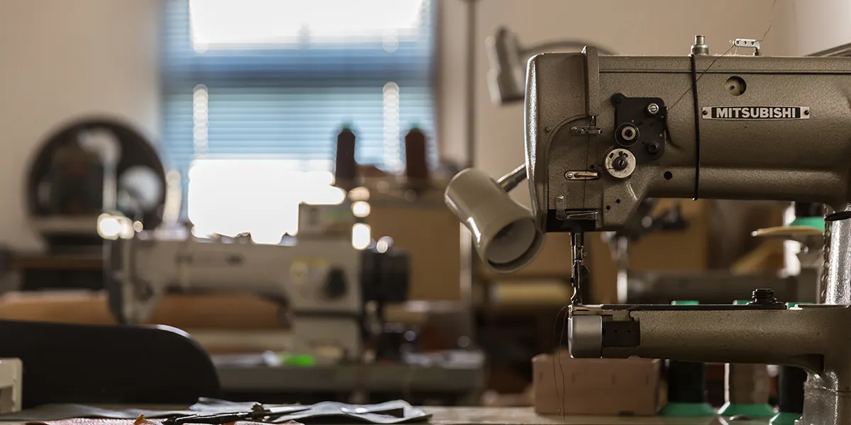 ビルの中にある工房の他に、店内にも工房が併設されており、お店の中にはいつも大きな工業用ミシンの音が鳴り響いています。