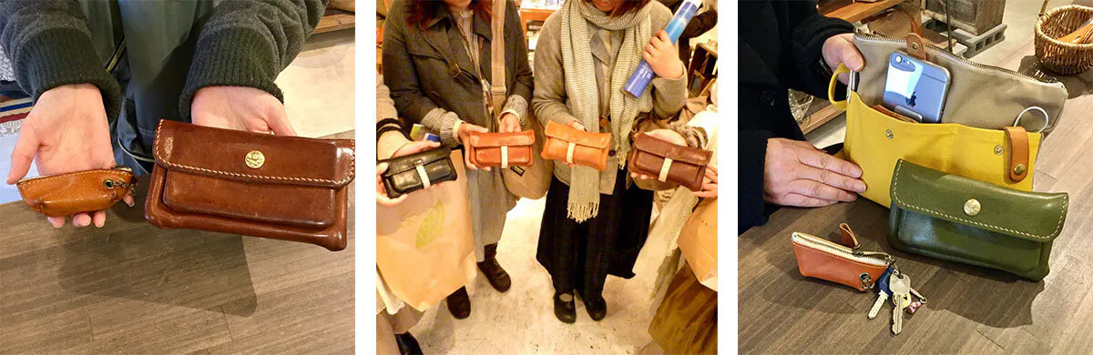 ▲革小物は皆さん味出しを楽しんでいます。タンニン鞣しのレザーは使い込むほどにツヤが出ます。