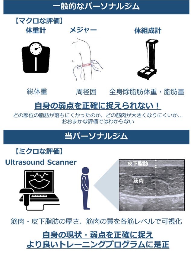 しかし、これらの方法では、見た目からは判断できない身体のミクロな変化を捉えることができないので、「どの部位の脂肪が落ちにくかったのか」、「どの筋肉が大きくなりにくかったのか」といった詳細な情報が得られません。