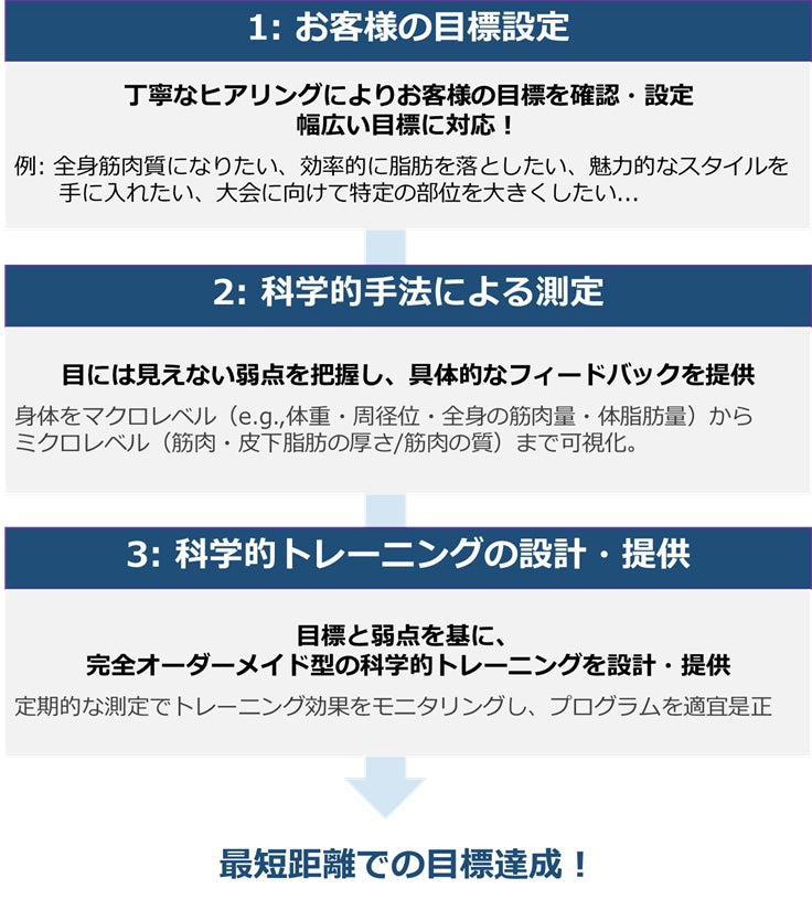 “お客様の現状を科学的測定によって明確にし、科学的に正しいトレーニングプログラムを提供することで、個々人の目標に最短距離で迫っていく”