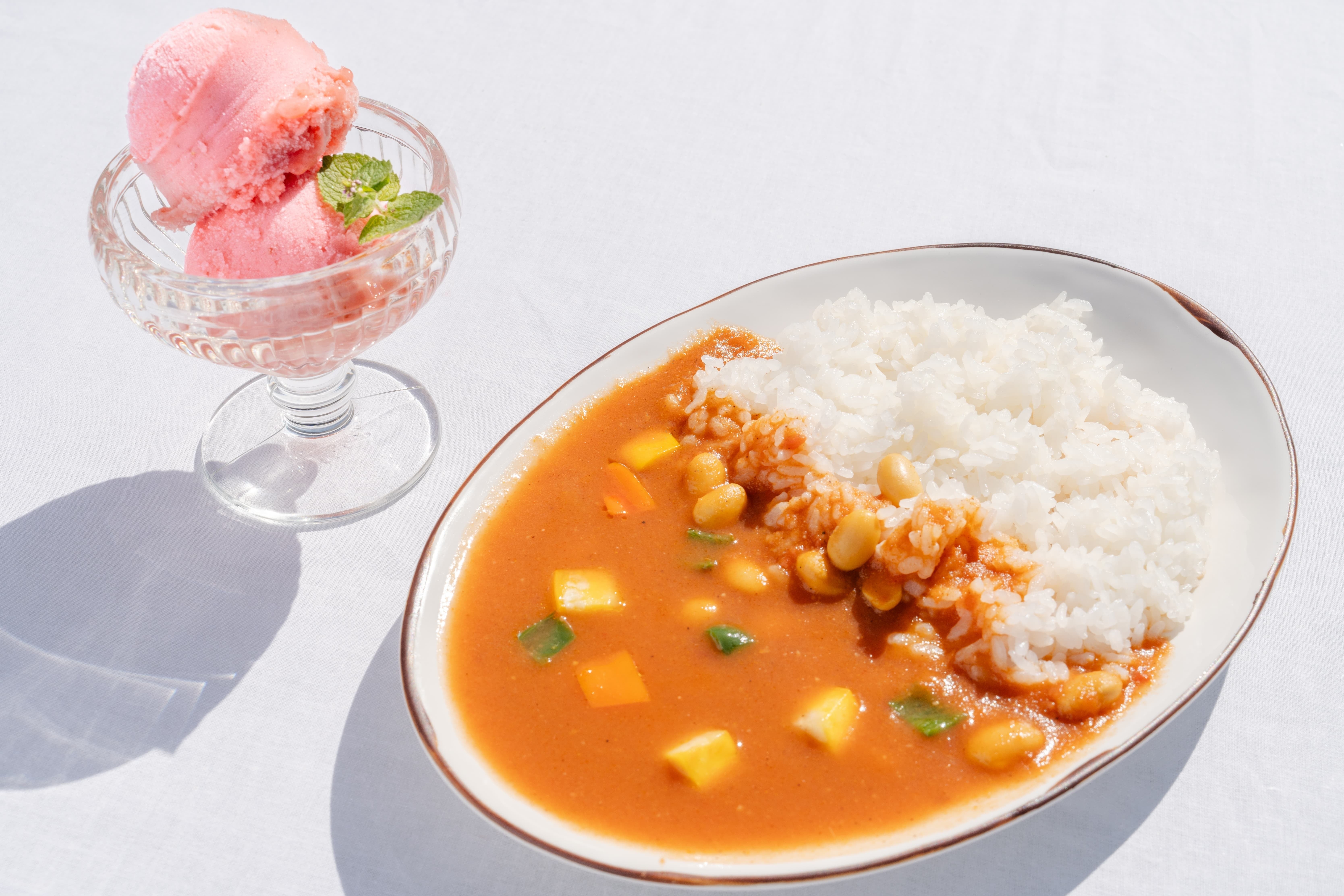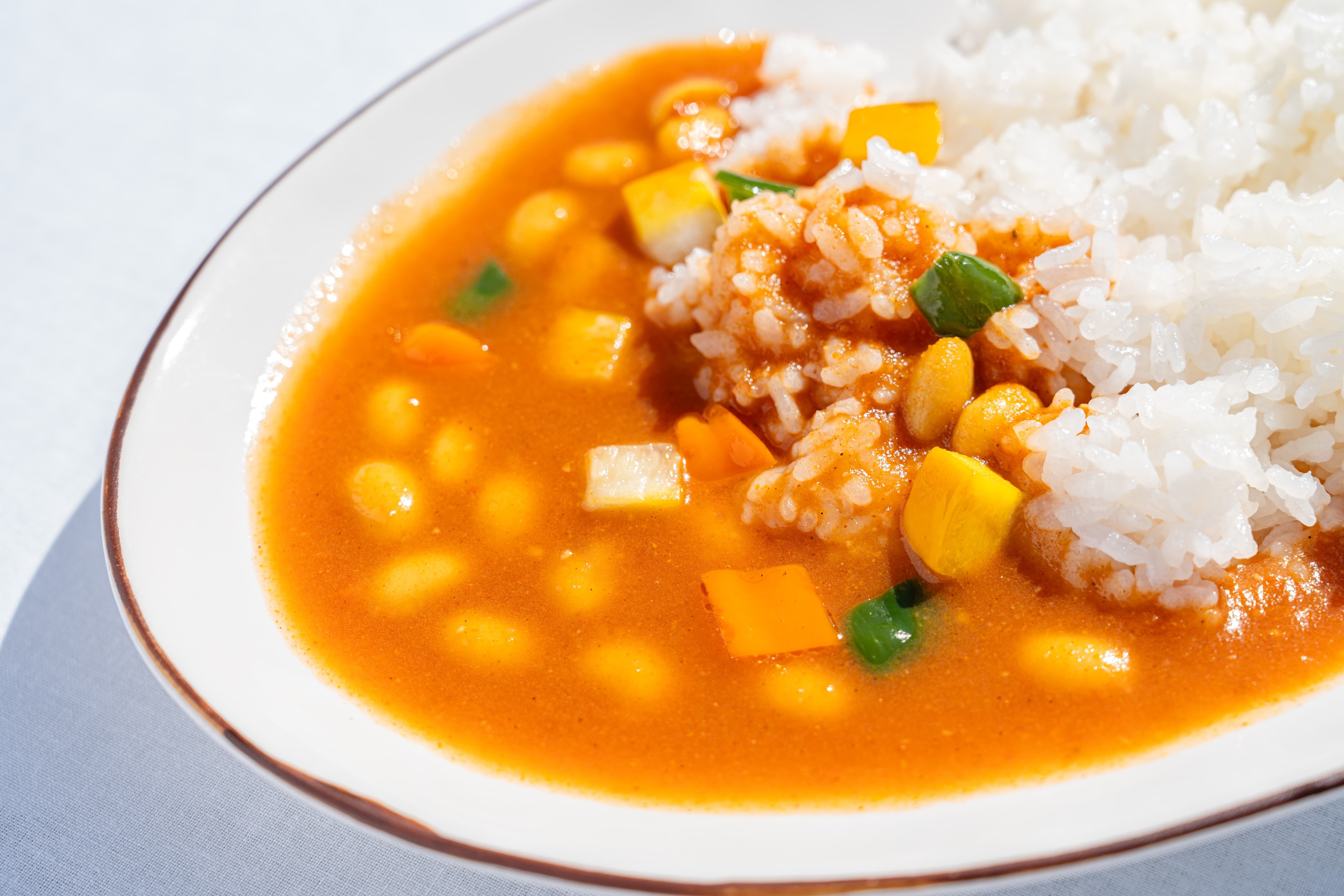 野菜皮やキャベツの芯、通常捨てられてしまう長ネギの青い部分、規格外で市場に出せない人参などを出汁として使用した、佐渡産大豆由来のプラントベースかつグルテンフリーなカレーです。